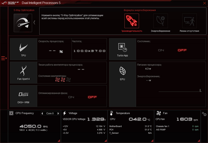 В состав комплекса фирменного ПО Ai Suite 3 включён мастер по настройке системы, его миссия основана на пяти компонентах, каждый можно открыть и подстроить индивидуально. Особо интересен блок TPU, тут есть набор напряжений, их смена в режиме «на лету» способна значительно облегчить проведения разгонных экспериментов. Силами Ez Update доступна смена изображения на стартовом экране.