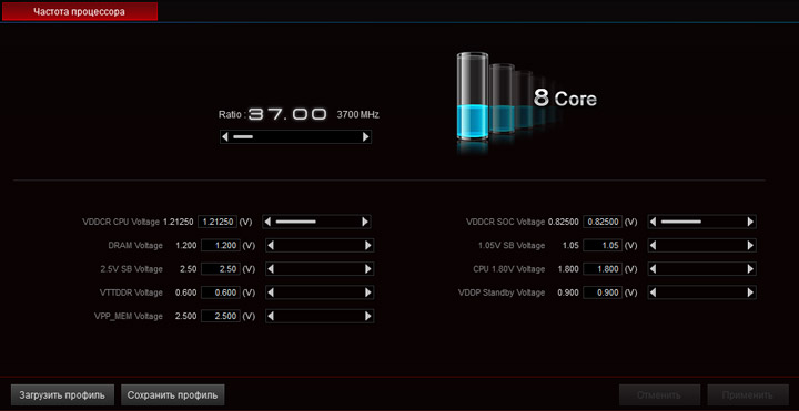 | VDDCR CPU Voltage Override (В) | 0,75–2,00 | 0,00625 |