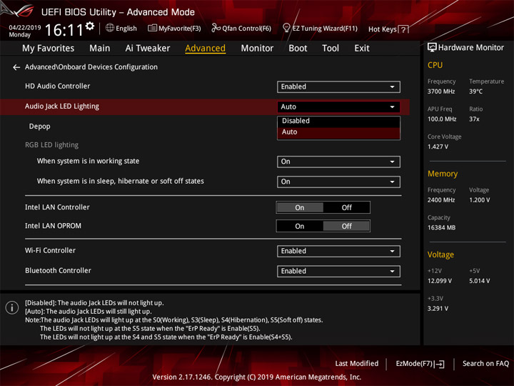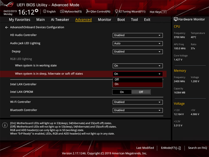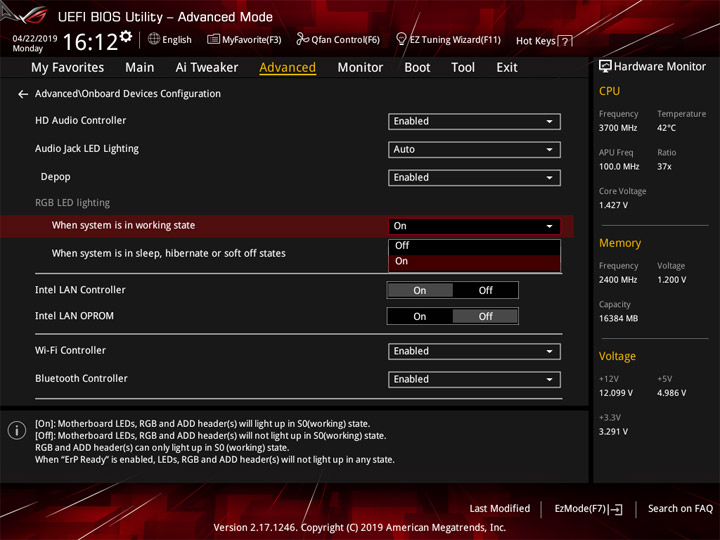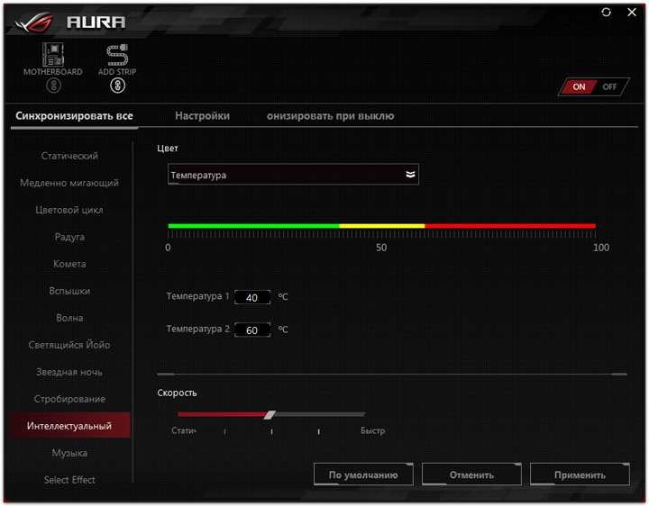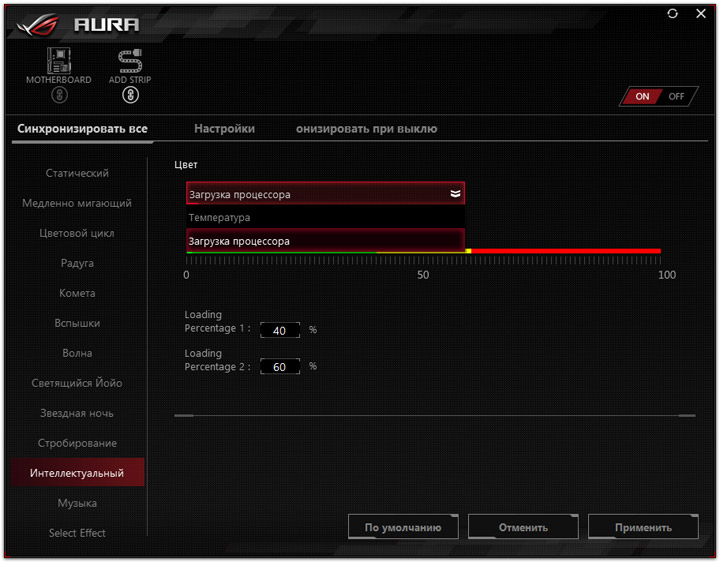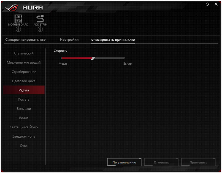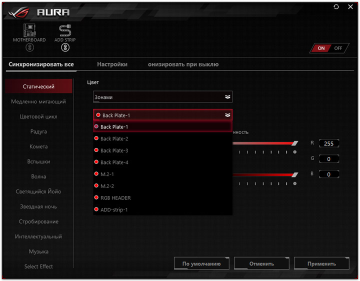 Система наладки иллюминации состоит из сценариев свечения устройств, подключаемых через пару площадок на плате, а также шести предустановленных групп — двух точек на охладителе M.2 и четырёх трио, распаянных сзади. Часть схем предусматривает раздельную настройку, в других вся система индикации синхронизирована.