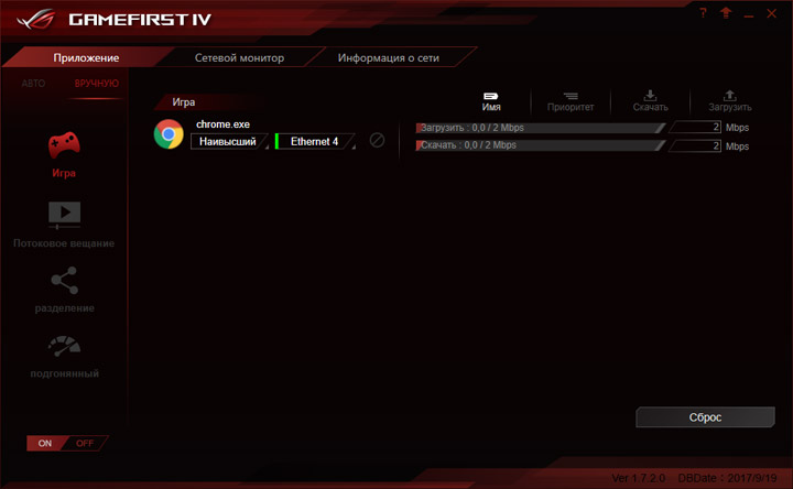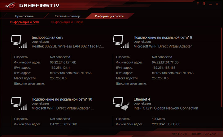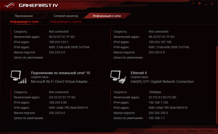 Сетевая подсистема, состоящая из адаптеров беспроводной и проводной сетей, также включает бонусное ПО — GameFirst IV, корни которого уходят к cFosSpeed. Тут предпочесть можно автоматический режим управления приоритетом сетевых приложений, либо взять полный контроль в свои руки.