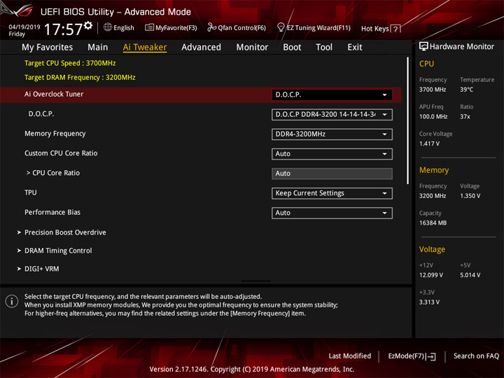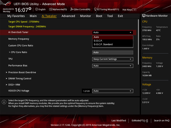 Наиболее простой способ ускорить систему — активация XMP, названная инженерами ASUS D.O.C.P. Проходит установка частоты и основной схемы задержек ОЗУ, повышается напряжение на модулях и SOC, до 1,1 вольта в последнем случае.