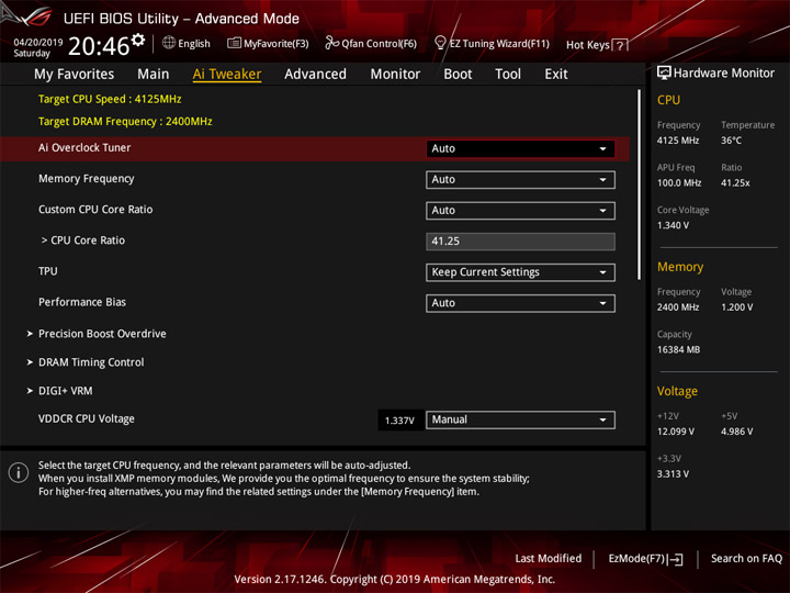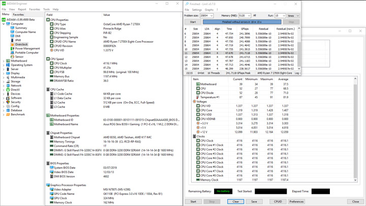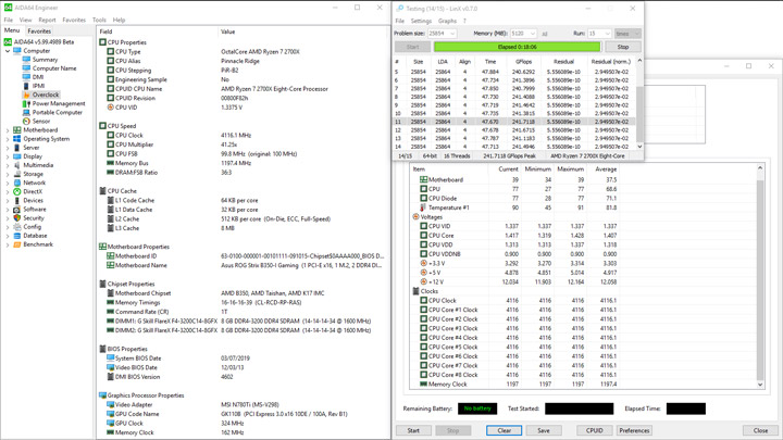 Испытания в ручном режиме вышли по истине благодатными. Вначале получилось подтвердить максимальный режим разгона нашего экземпляра Ryzen 7 2700X, для множителя x41.25 оказалось достаточно скомбинировать уровень напряжения 1,3375 В и Level 4 в качестве профиля LLC. Удивителен наименьший уровень напряжения, который до сих пор фиксировался на испытуемых!