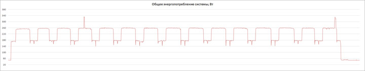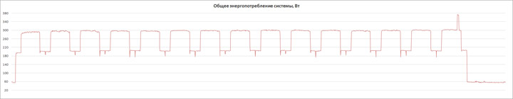 Температура окружающей среды равнялась 24 градусам, на верхней грани радиатора я фиксировал не больше, чем 68°C. Потребление энергии составило 55–304 Вт, без учёта кратковременного перехода в режим 3D у GPU.