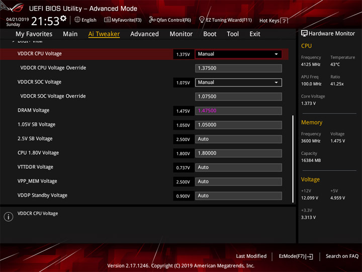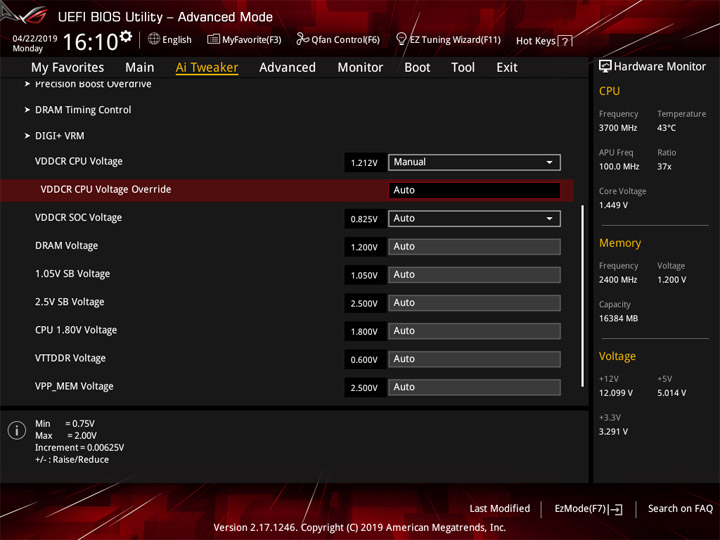 | VDDCR SOC Voltage Override (В) | 0,75–1,80 | 0,00625 |
