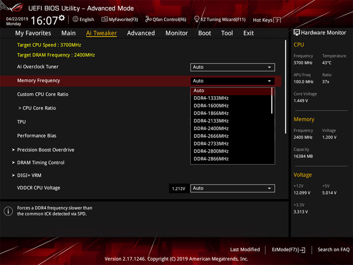 Для разгона ЦП необходимо воспользоваться профилями TPU. Первый нарастит множитель до отметки x40. Других видимых изменений в настройках UEFI нет, ОЗУ будет работать на частоте 2400 МГц.