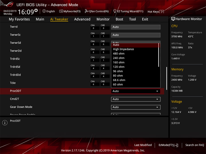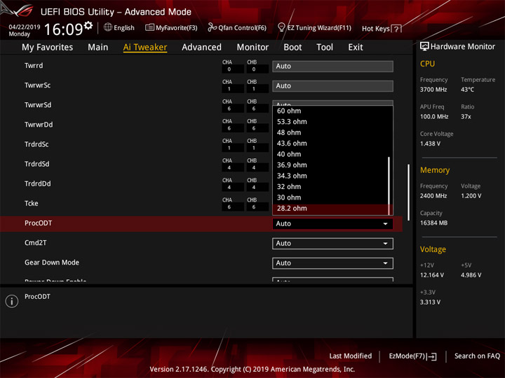 ProcODT платой выставляется как 60 Ом, потому вручную пришлось указать более подходящие 53,3 Ом. На этом тонкая подстройка ОЗУ была завершена. Для VRM произошло преодоление отметки в 100 °С, а термотроттлинг на плате при этом не активировался, очевидно, инженеры запланировали ещё более поздний порог для этого события. Заметно подросла температура процессора, но, напомню, с таким уровнем напряжения он работал при частоте памяти, равной 2400 МГц, вспоминая про другие платы, а при разгоне его нагрев уже был повыше.