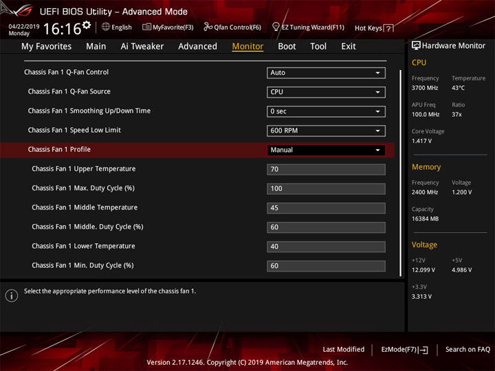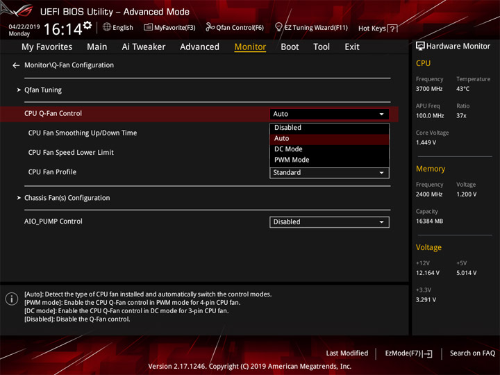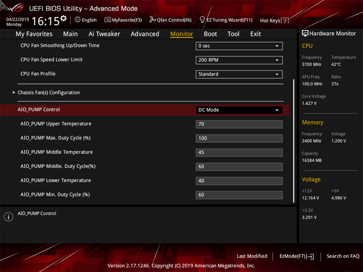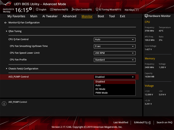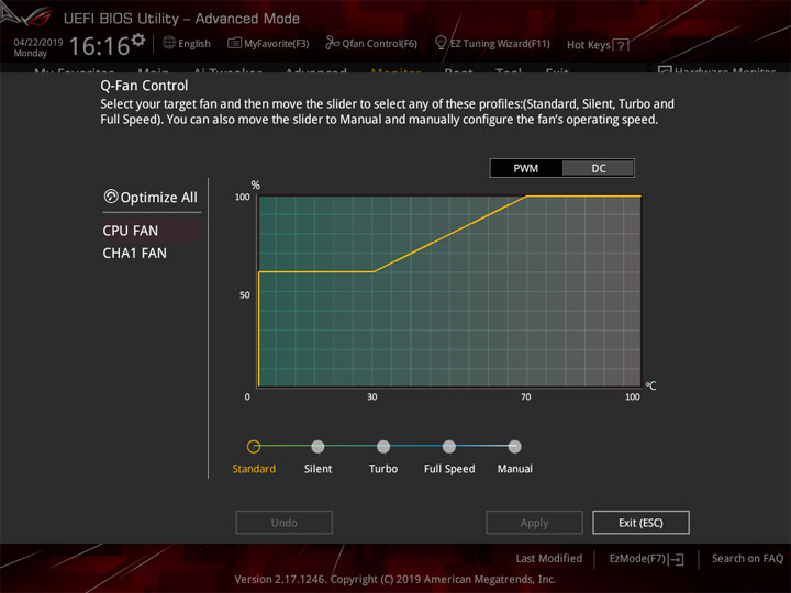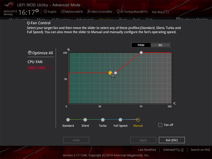 На каждом из трёх каналов под системные охладили (или помпы) есть выбор способов управления частотой вращения — PWM или DC. Вручную корректировать алгоритм можно путём изменения значений в текстовых полях, либо посредством интерактивной формы (F6).