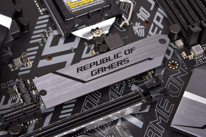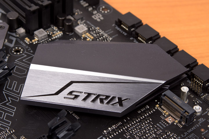 Изображение платы нанесено прямо на лицевую сторону коробки. Там легко выделить светодиодный узел, вмонтированный в накладной козырёк, разместившийся над портами ввода-вывода. Ещё заметить можно и охладитель под устройства формата M.2.