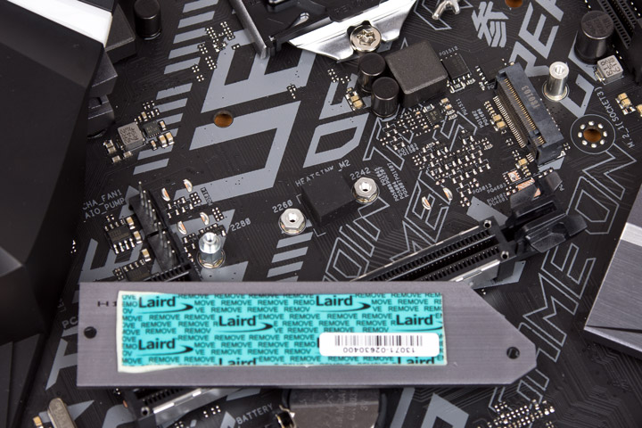 Для верхнего гнезда M.2 предустановлен охладитель. Для обеспечения теплообмена с накопителем есть полоска термолипучки, но её площадь могла бы быть и больше.