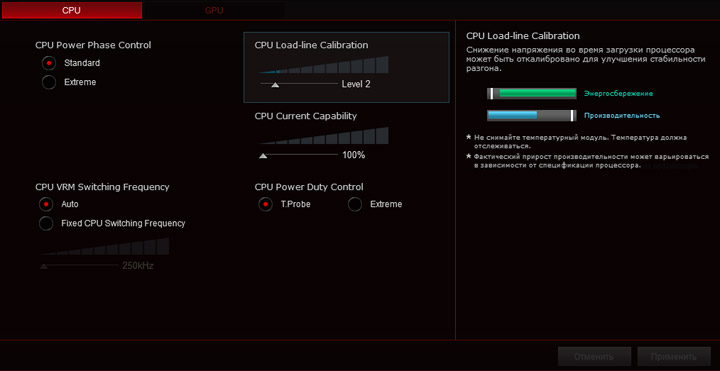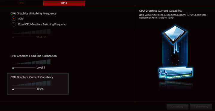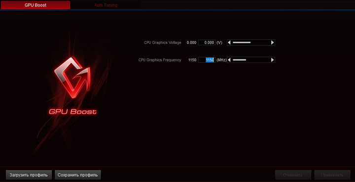Профиль по разгону дублирует возможности UEFI и относится лишь к интегрированному видеоадаптеру. В целом, функции, доступные здесь, отнюдь не новы, да и вид не изменился относительно продуктов прежних поколений.