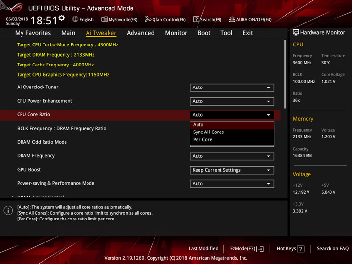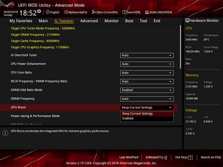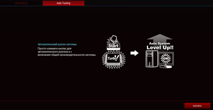 Разгонное меню Ai Tweaker вобрало множество полей с изменяемыми значениями. Но как мы помним, ни ЦП, ни ОЗУ фактически не разгоняются. Фирменный профиль для оверклокинга носит недвусмысленное имя GPU Boost.
