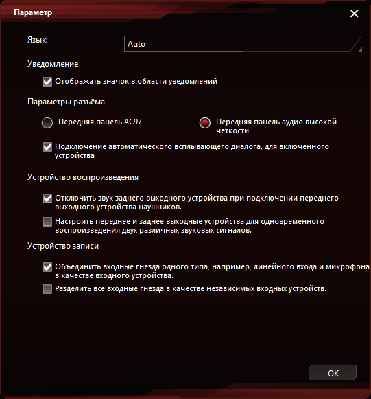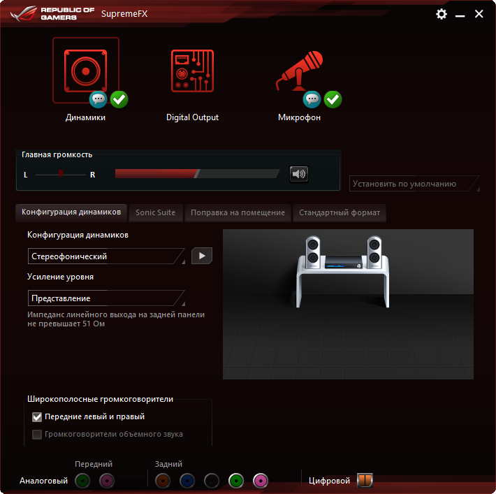 Первичная наладка звучания проходит в среде конфигуратора Realtek. Есть три профиля с предусилением выходного сигнала и пара видов подключенных устройств для заднего выхода. Всё это так или иначе меняет воспринимаемую картину. К слову о ней. Не смотря на старшую версию кодека и схемотехнический подход, не первый раз реализуемый на платах ASUS, похвалить эту испытуемую не за что. Акцент выполнен на мид-басе, из-за чего страдает буквально всё остальное. Нет внятной сцены, точности позиционирования, ярких ВЧ, выразительного вокала или хлёстких барабанов. Всё нивелировано искусственно созданной «глубиной». Хотя и такой подход, уверен, кому-то придётся по душе.