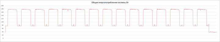 Замеры выполнялись после прохождения всех прочих тестов в «устоявшемся» режиме компьютера при помощи прибора собственной разработки. Для создания нагрузки использовался профиль In-place large FFTs в составе утилиты Prime95 (29.3). Производился расчёт среднего значения потребления тестового стенда «от розетки» на протяжении восьми минут работы программы, а затем, после завершения теста, ещё минуту замерялся уровень, соответствующий состоянию простоя системы.