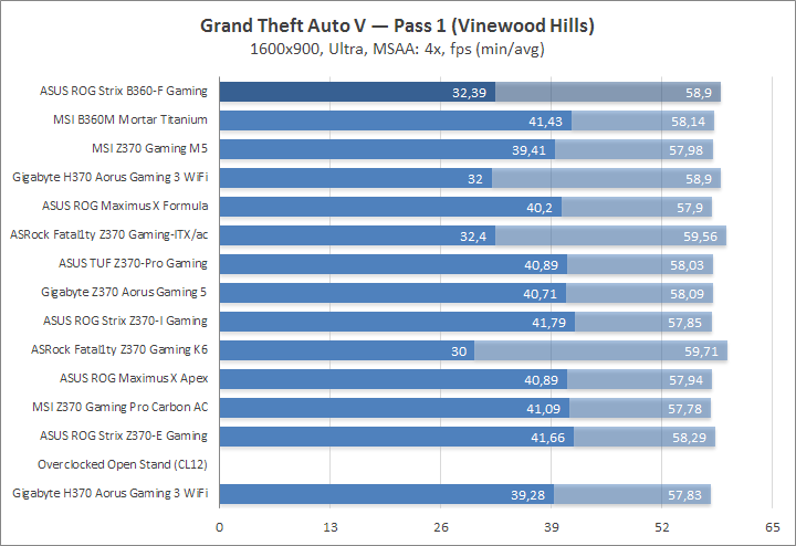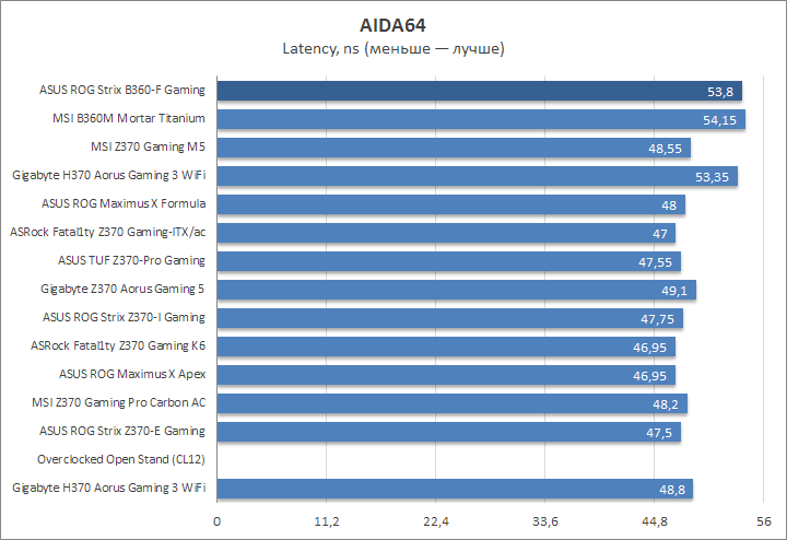 Напряжение на модулях ОЗУ росло до 1,36 В, вспомогательные SA и IO равнялись 1,072 В, а процессорное колебалось в пределах 1,184–1,2 В, исходя из числа задействованных потоков. В ряде случаев получились сниженные результаты, природа которых уже была изучена в обзорах ASRock Fatal1ty Z370 Gaming K6 и Gigabyte H370 Aorus Gaming 3 WiFi. По результатам разогнанной системы при участии последней платы можно получить представление, какой должна быть истинной производительность (особенно в играх, где наиболее заметна агрессивная работа Intel Speed Shift).