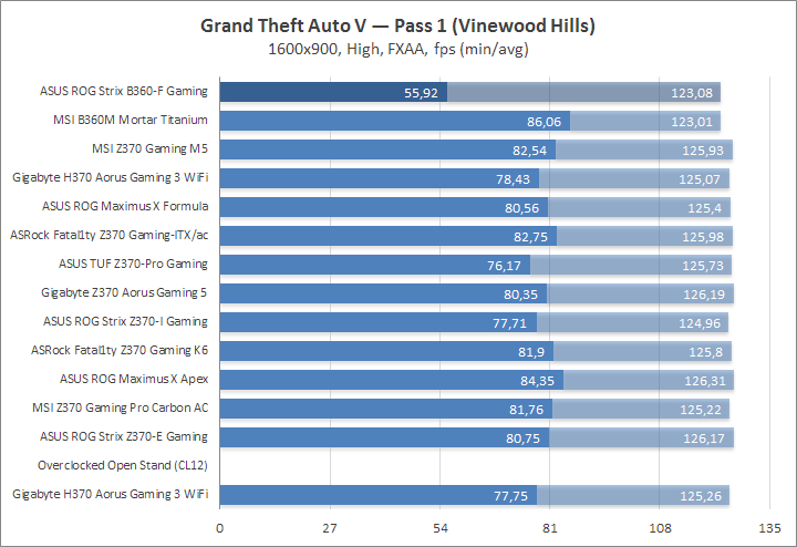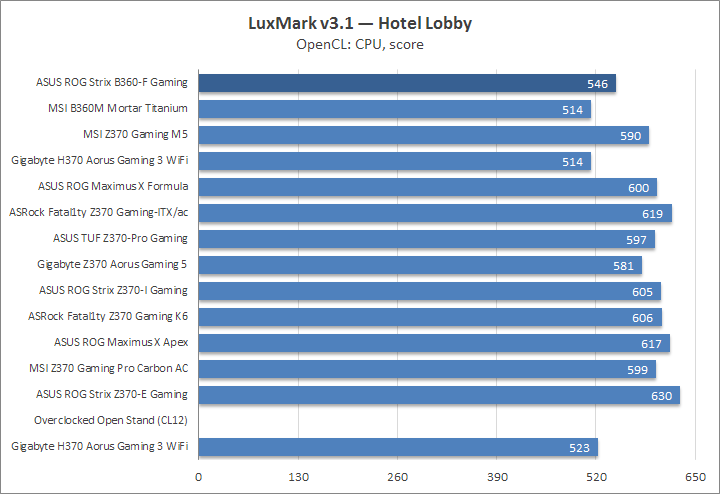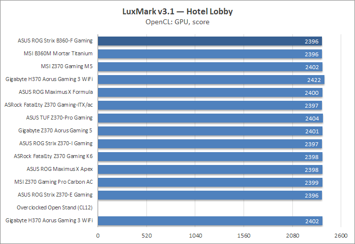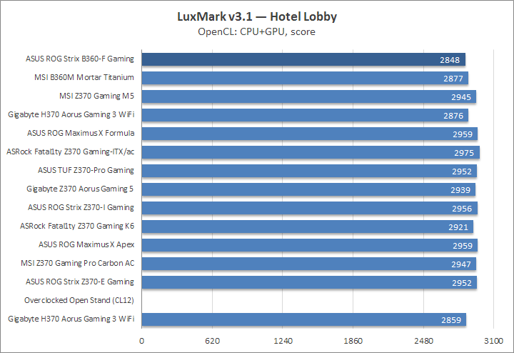 LuxMark хорошо реагирует на производительность подсистемы памяти и тут ROG Strix B360-F Gaming смогла с лучшей стороны проявить себя.