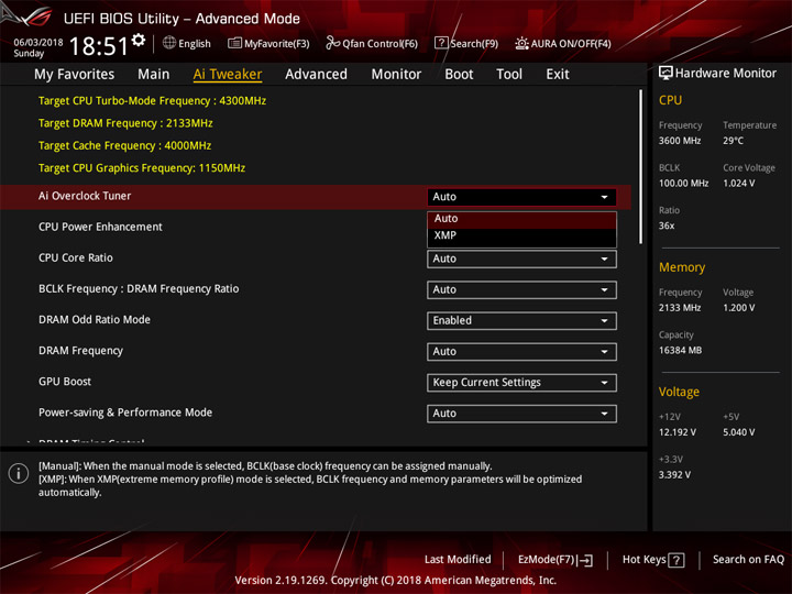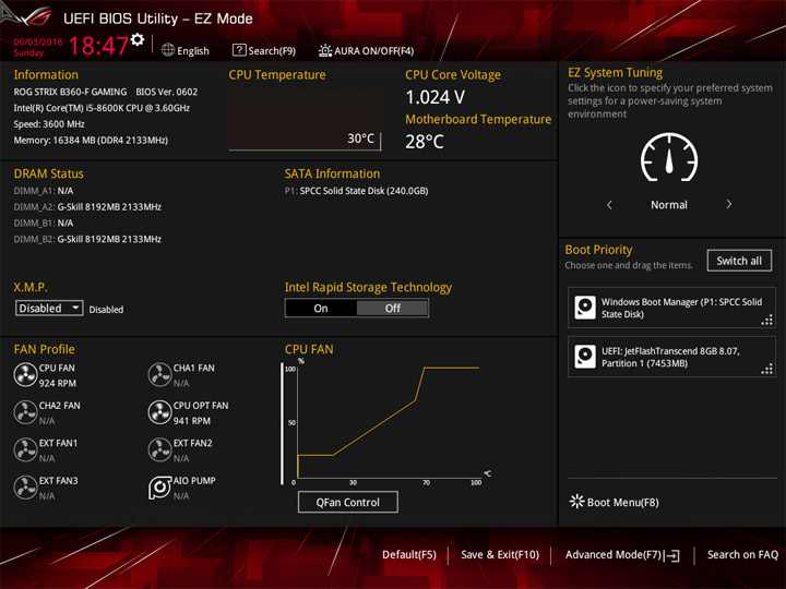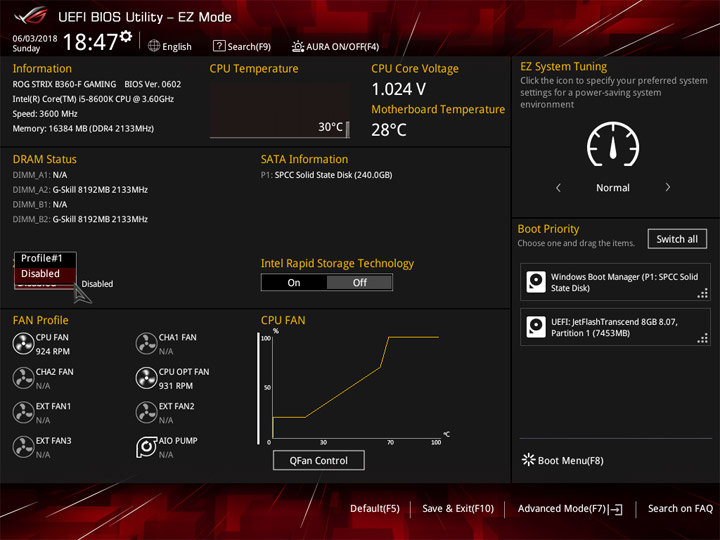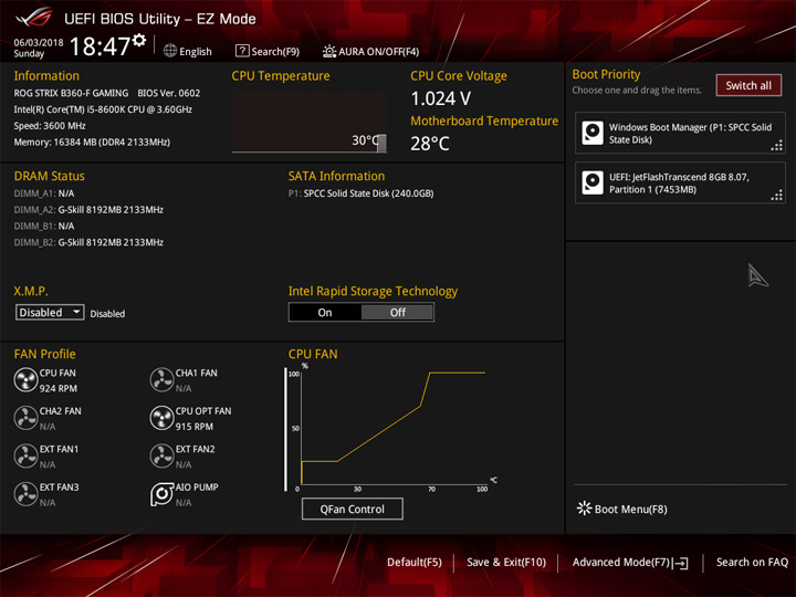 В режиме отображения базовой оболочки с настройками доступны функции по активации XMP и установки порядка среди загрузочных устройств.