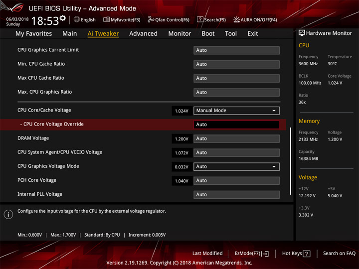 | CPU Core Voltage Override (В) | 0,6–1,7 | 0,005 |