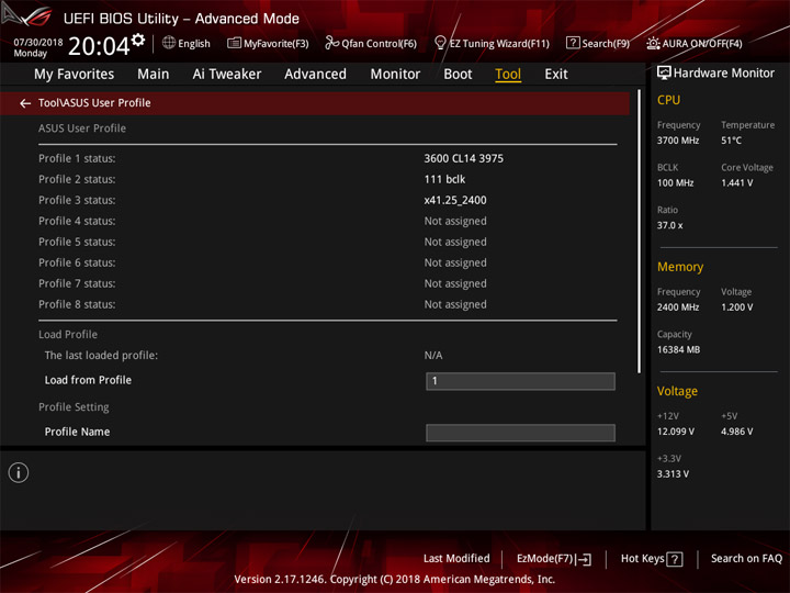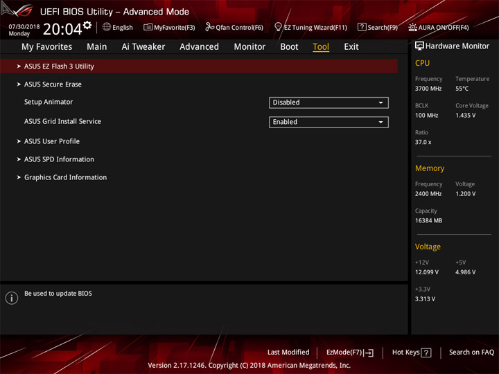 Вновь отмечу наличие среди перечня фирменных инструментов ASUS Grid Install Service. Подробнее о нём — чуть позже. Остальные пункты привычны, удобно хранить настройки системы в одном из восьми профилей, указывая желаемое название.