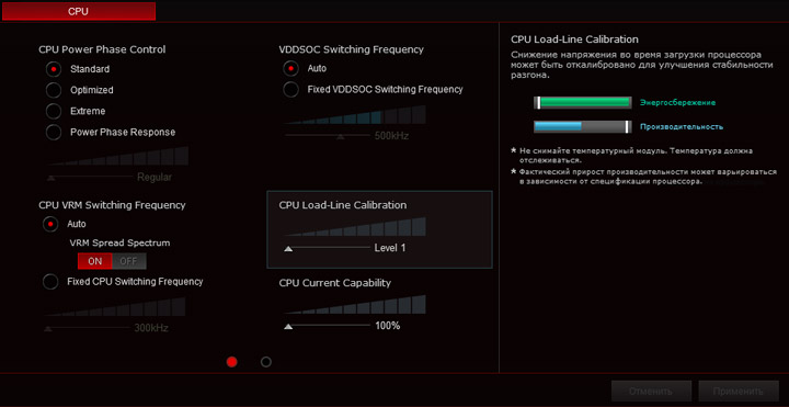 Узел питания снабжён профилями LLC для двух основных напряжений. Их установить можно как вручную, так и указав прибавку к основной величине (метод offset).