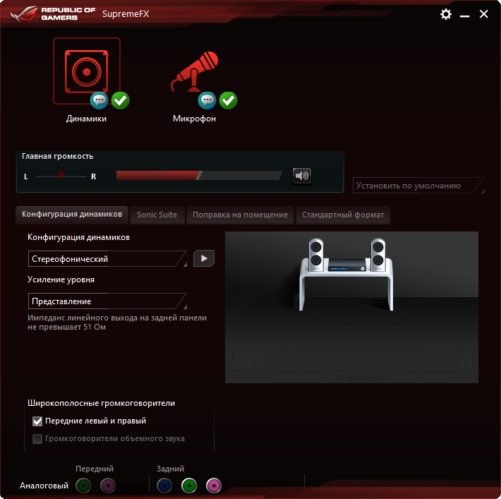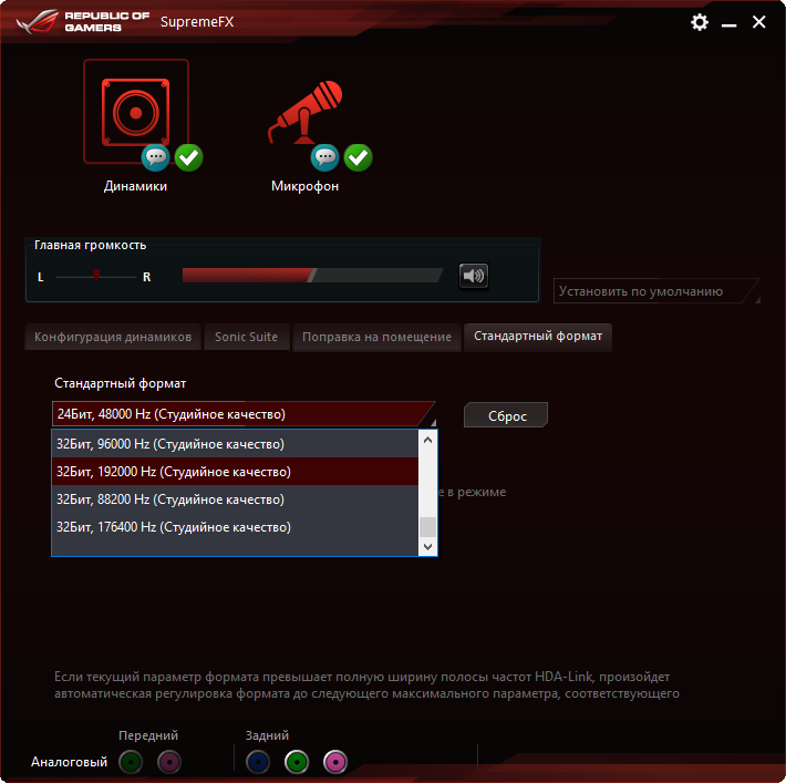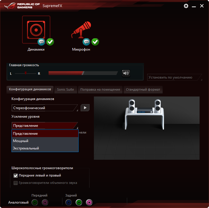 Первичная настройка звучания реализована через фирменный конфигуратор Realtek. Оптический интерфейс отсутствует, потому меню выглядит немного ужатым. В наличии профили для подключаемого оборудования и несколько типов предусиления выходного сигнала.