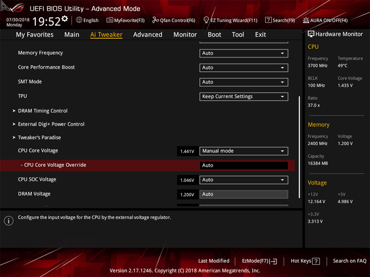 | CPU Voltage Override (В) | 0,75–2,00 | 0,00625 |