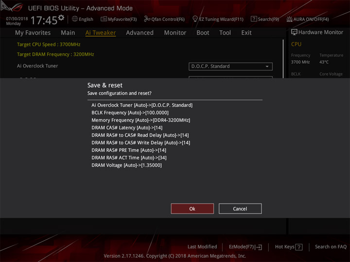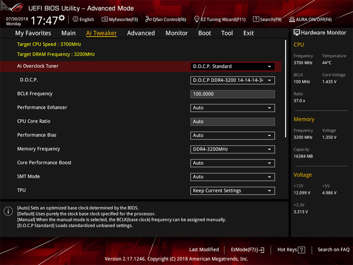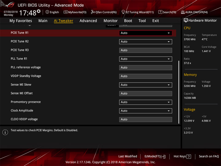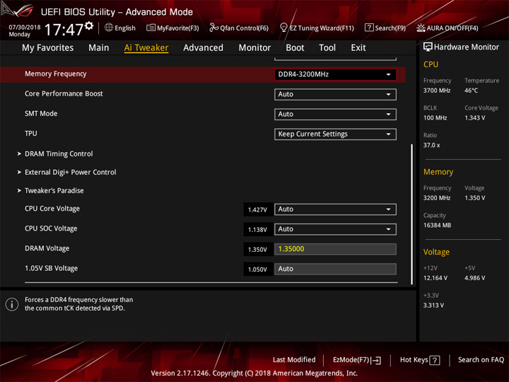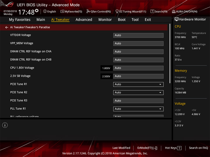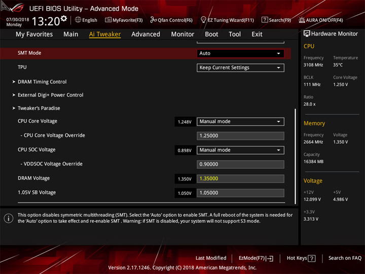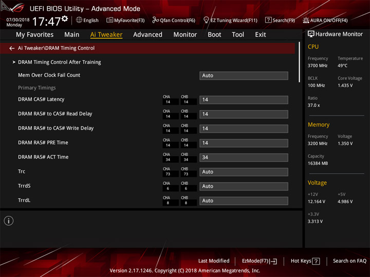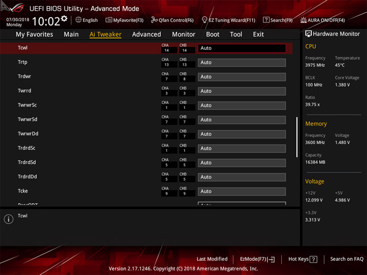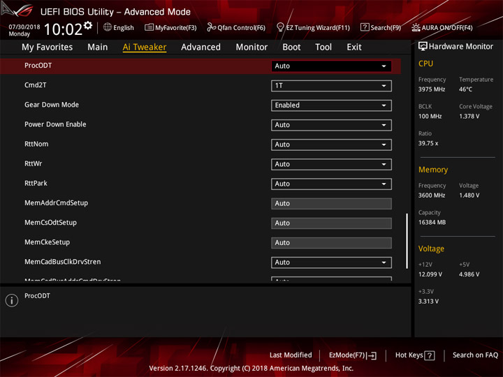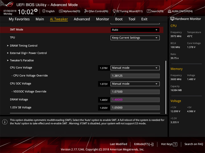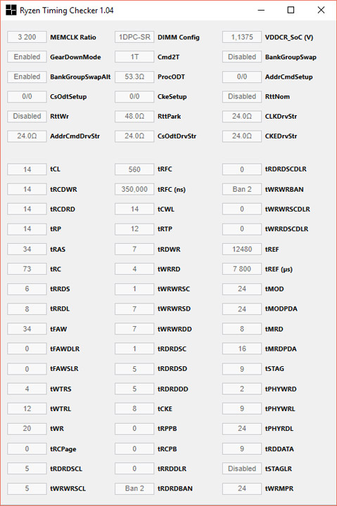 Испытания с разгоном памяти удалось успешно завершить на частоте 3600 МГц. Использовалась схема из основных задержек вида 14-16-16-16-28-1T. Для этого оказалось достаточно зафиксировать напряжение, подаваемое на модули, в позиции 1,48 В. Сопутствующую величину для процессора я был вынужден поднять до 1,38125 В. Его множитель в результате экспериментов оказался равен x39.75, что на один шаг лучше, чем в прошлый раз, не смотря на грозный статус той платы. Дополнительно в UEFI потребовалось активировать пункт GearDownMode.