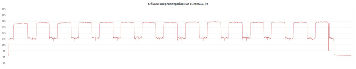 Прогрев верхней грани радиатора достигал 77 °C, потребление энергии стендом уложилось в границы 64 и 293 Вт. На графике потребления любопытно отметить скачок вниз в самом конце испытания, очевидно, это вновь сработали механизмы защиты, на результат вычислений они повлияли незначительно.
