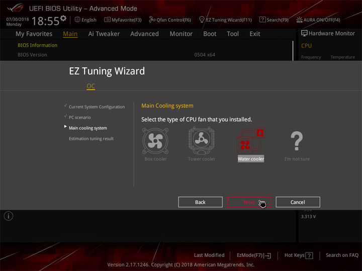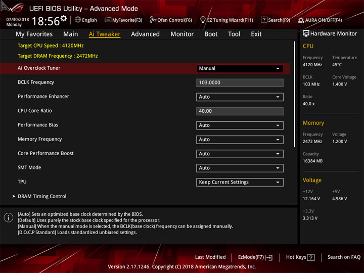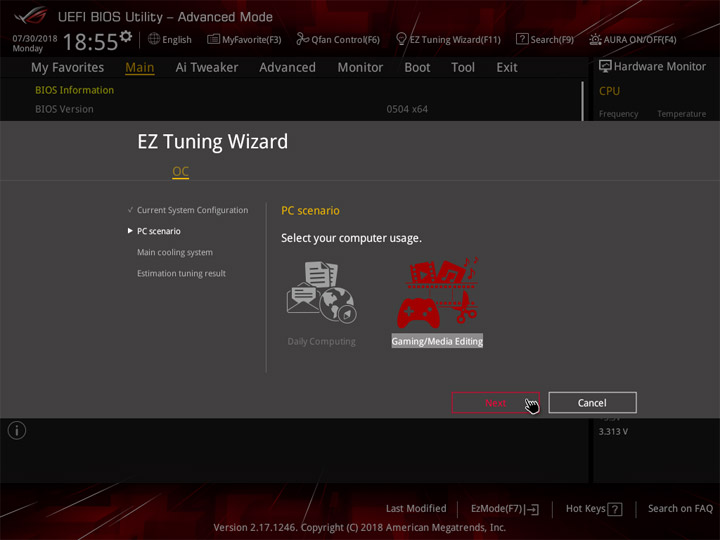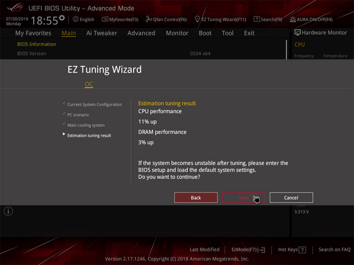 Интерактивный помощник по выбору схем ускорения EZ Tuning Wizard предложит самый жёсткий вариант разгона. С повышением базовой до 103 МГц, множитель ЦП повысится до x40, что выльется в значение 4119 МГц. Память улучшит скоростную формулу скорее благодаря сниженным задержкам, а частота её будет равна 2470 МГц.