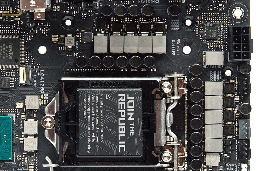 ASP1900B — перемаркированный ШИМ-контроллер, похоже, восьмифазный. Шесть сборок используются для напряжения ЦП, а ещё две — для iGPU. Внешних удвоителей фаз не видать. Модели элементов — NCP302045 производства ON Semiconductor, словом, база идентична используемой в конструкции ASUS Prime Z490-A. Напряжения IO и SA имеют единый источник, базирующийся на однофазном ШИМ-контроллере Richtek RT8125DGQW, транзисторы — вновь от ON Semiconductor, с маркировкой 4C06B и 4C10B, притом одни из них находится без контакта с радиатором, потому я бы не стал подвергать этот узел экстремальным нагрузкам. Ближе к слотам ОЗУ расположился сектор питания этого узла на плате, все дроссели соседствуют очень близко. Конденсаторы «военного» класса надёжности со сроком работы до пяти тысяч часов в условиях повышенных температур.