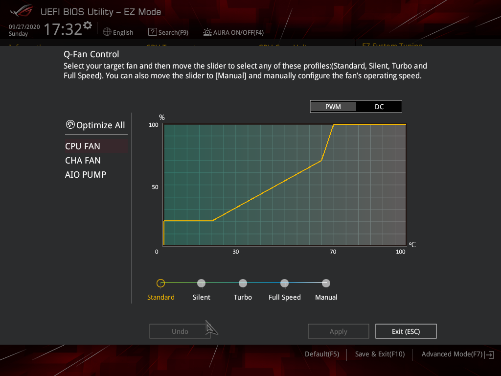 На всех трёх площадках допускается выбор между способами PWM или DC как основополагающих для работы охлаждающих устройств. Минимальной рабочей отметкой в ручном варианте управления окажется «60 %», понизить планку поможет калибровочный мастер оборудования Qfan Tuning.
