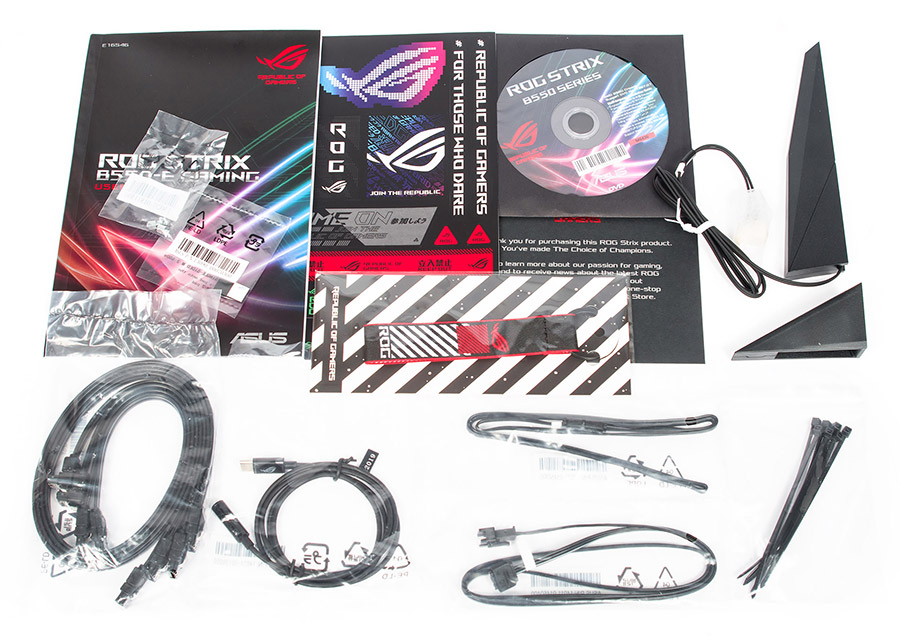 - комплект наклеек с различными изображениями серии ROG Strix, в том числе и для кабелей;