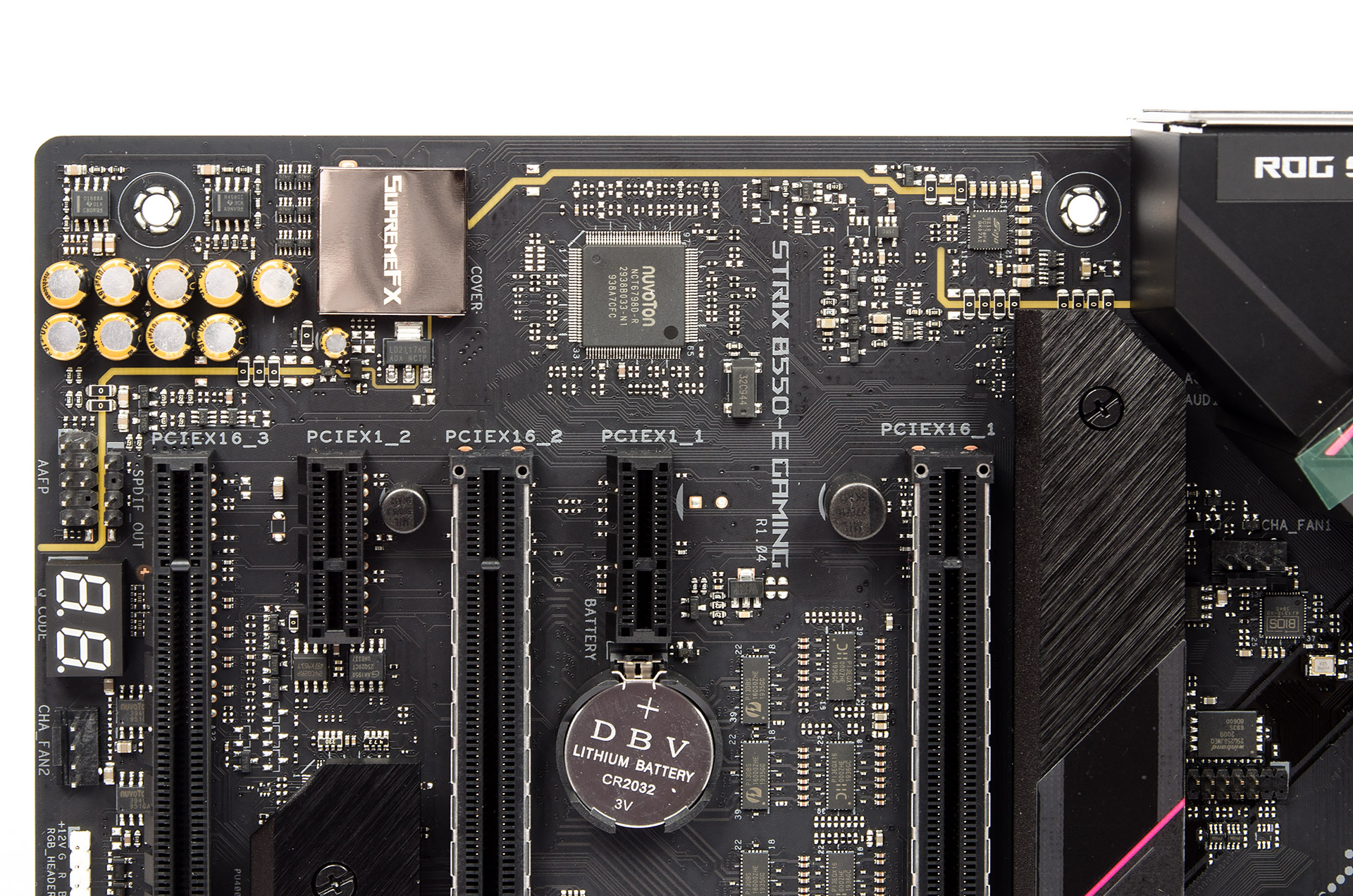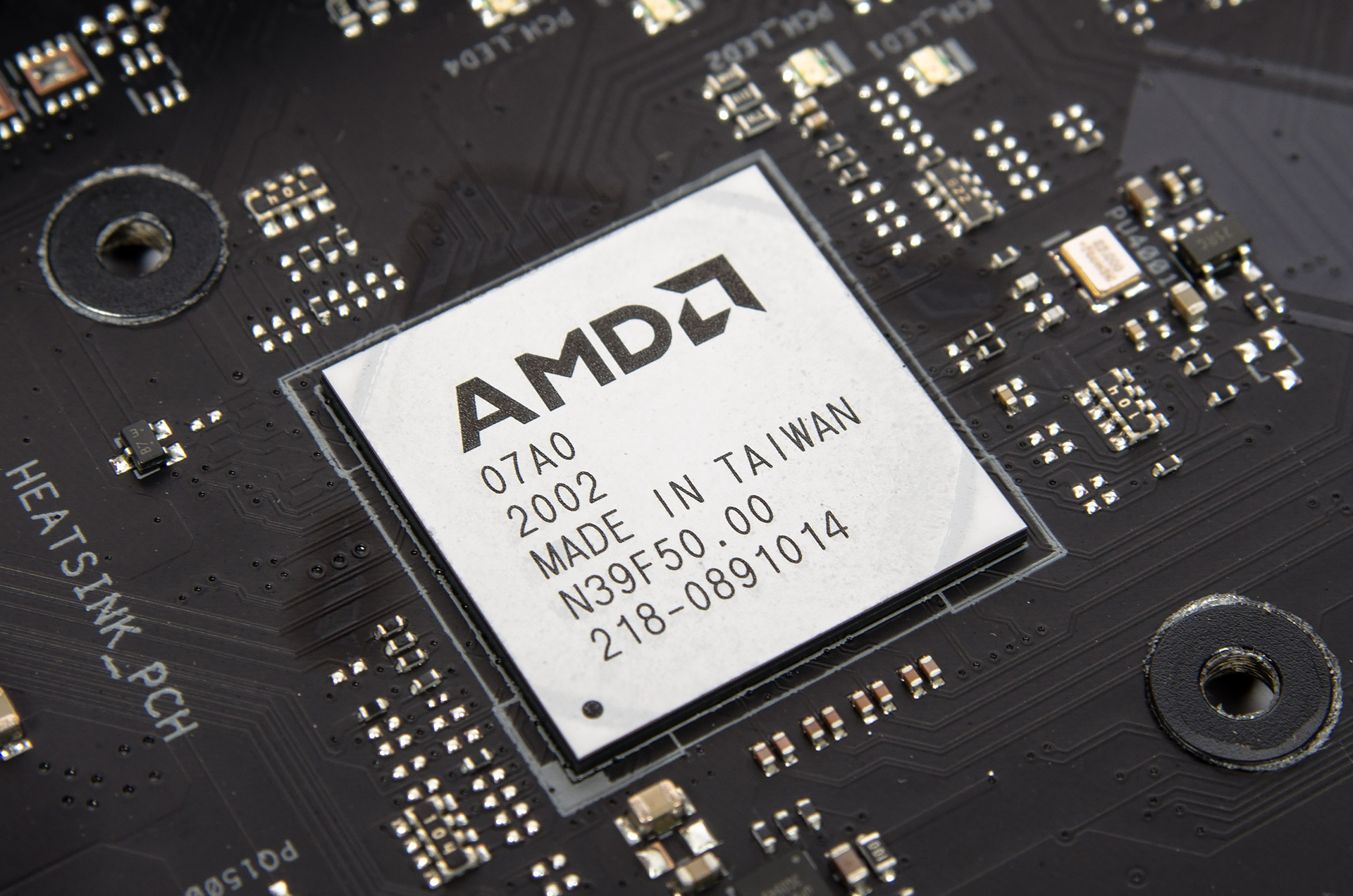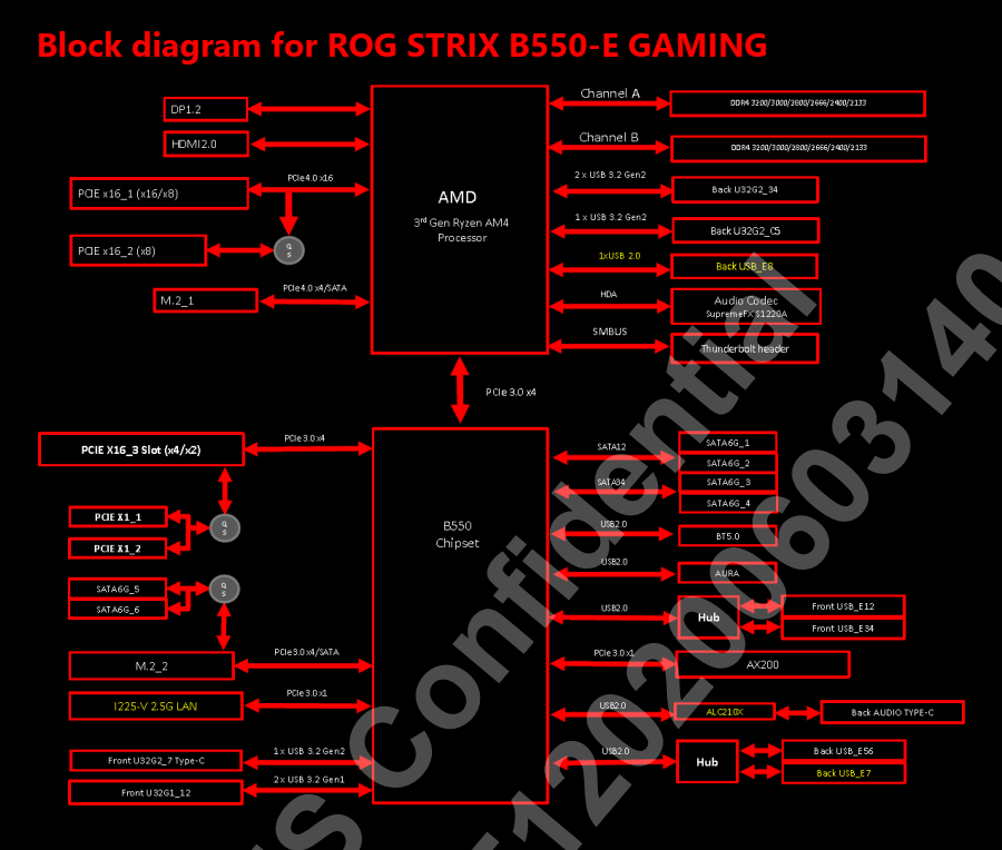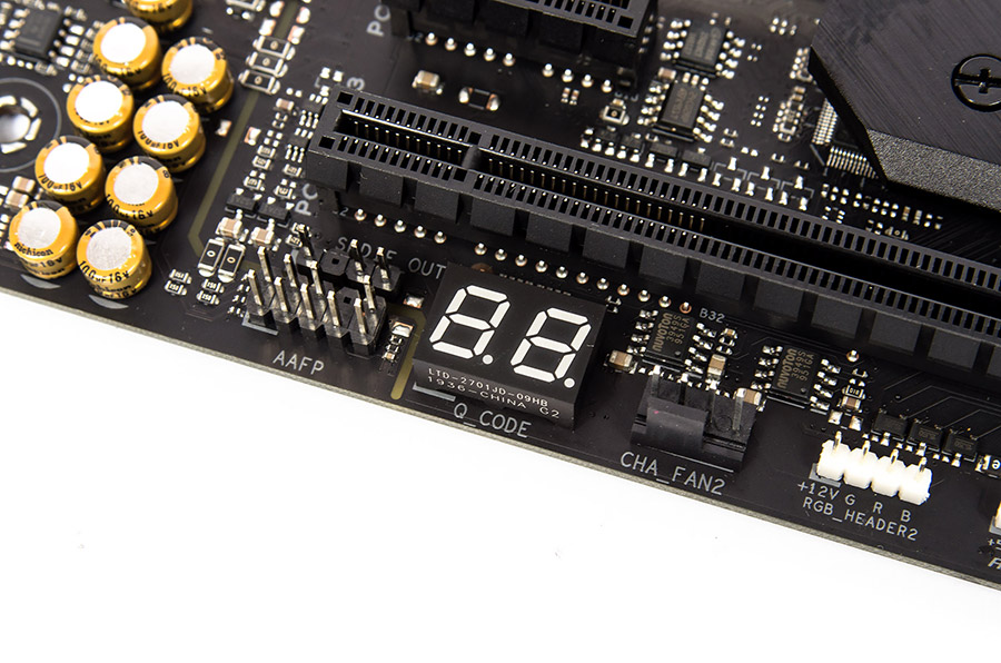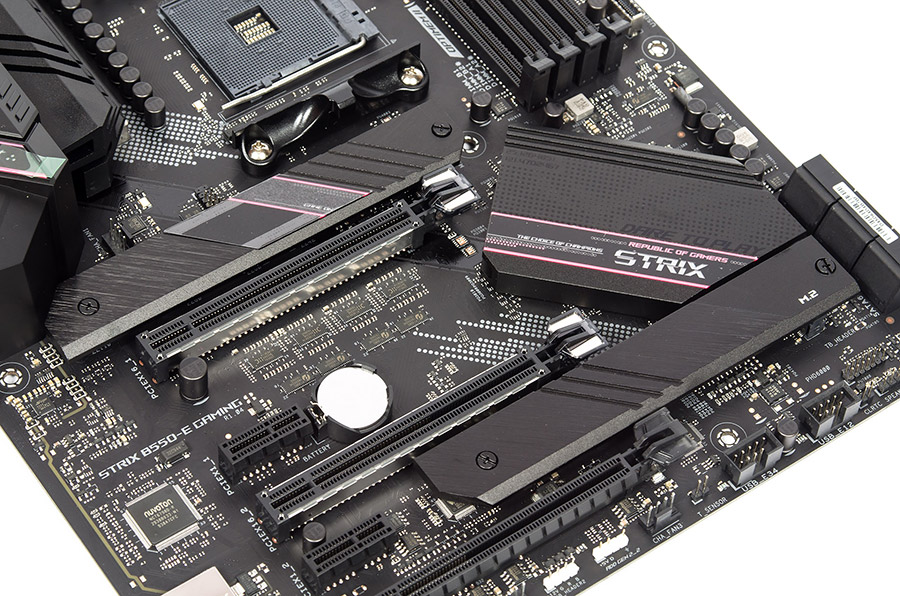 Распаяны четыре повторителя сигнала и четыре свитча для способности поровну разделить 16 линий PCI-E (от ЦП) между парой полноразмерных слотов, так же реализация проводилась и на устройствах ASUS при участии AMD X570.