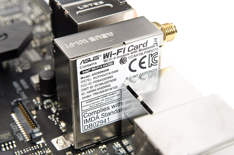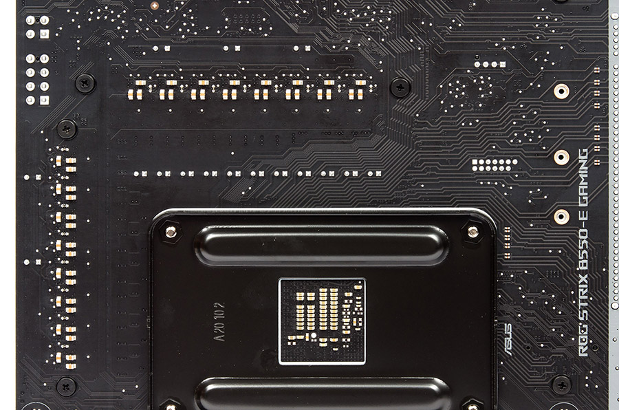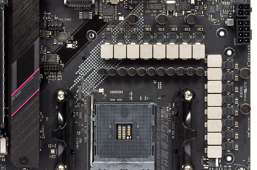 Идея организации VRM также сильно напоминает плату ROG Strix X570-E Gaming. Число, тип, места распайки дросселей и конденсаторов буквально идентичны. Но техническая реализация в корне отличается. Впервые вижу перемаркированный ШИМ-контроллер ASP2006, он имеет поразительно низкое число выводов — 40. Структура стабилизатора описывается формулой 14+2 канала для напряжений CPU и SOC. По всей видимости, речь идёт о реальных семи фазах для первого напряжения — используется приём удвоения числа элементов в составе каждой. Также лишь по предположению, два канала SOС Voltage ведут к удвоителю, замеченному неподалёку от контроллера. Все 16 элементов — «Intelli-Phase Solution with Integrated High-Side and Low-Side FETs and Driver» от компании Monolithic Power Systems, также впервые встречаемой в рамках работы с платами ASUS. Эти сборки в каталоге компании отсутствуют, из маркировки можно выяснить следующее: MPS2010 — аббревиатура производителя и дата производства, а именно 2020 год, 10 неделя; MP86992 — сама модель. Вероятнее всего, в каждой находится температурный датчик, вывод основан на изучении возможностей других изделий подобной направленности производителя.