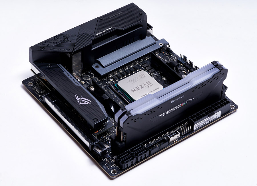 ASUS ROG Strix B550-I Gaming имеет 6 слоев PCB, топологию Daisy Chain и фирменную технологию Optimem II. Благодаря последней сигнальные трассы памяти аккуратно распределены по слоям печатной платы для уменьшения межслойных наводок, а также добавлены экранирующие зоны, которые значительно снижают перекрестные наводки. Для дальнейшего увеличения запаса по разгону, индивидуально откалиброванная Daisy Chain обеспечивает синхронизированную сигнализацию. В итоге мы можем претендовать на мировые результаты в домашних условиях, что, собственно, я вам на практике и продемонстрирую.