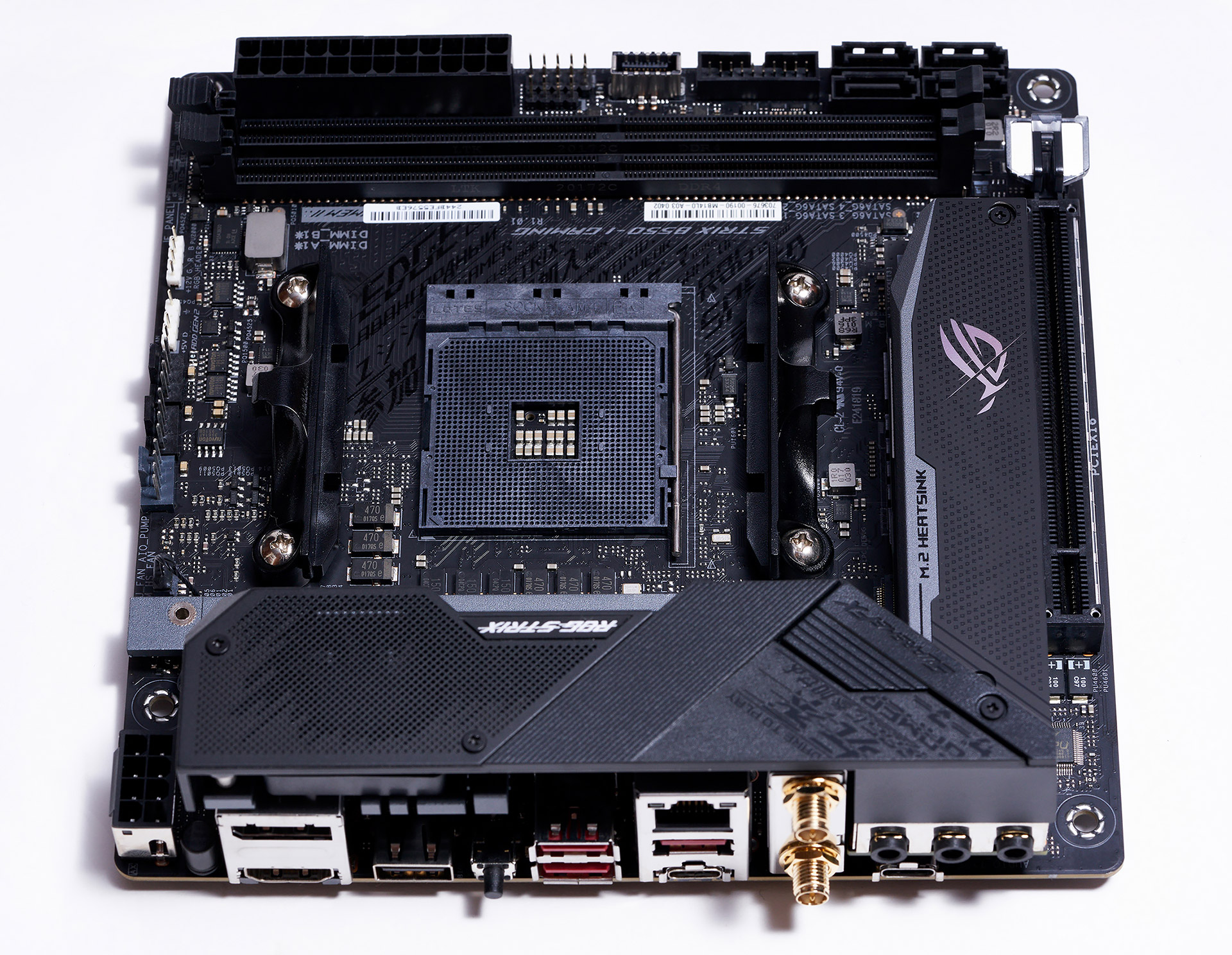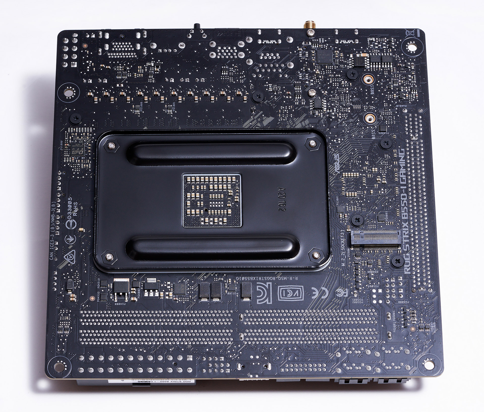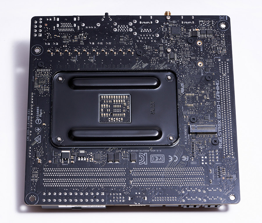 Кожух задней панели имеет вентиляцию в виде сетки, под которой скрывается маленький вентилятор, предназначенный для охлаждения радиатора зоны VRM. ASUS ROG Strix B550-I Gaming оснащена двумя слотами M.2, один расположен рядом с PCI-E x16 и оснащен собственным радиатором, а второй находится с тыльной стороны материнской платы.