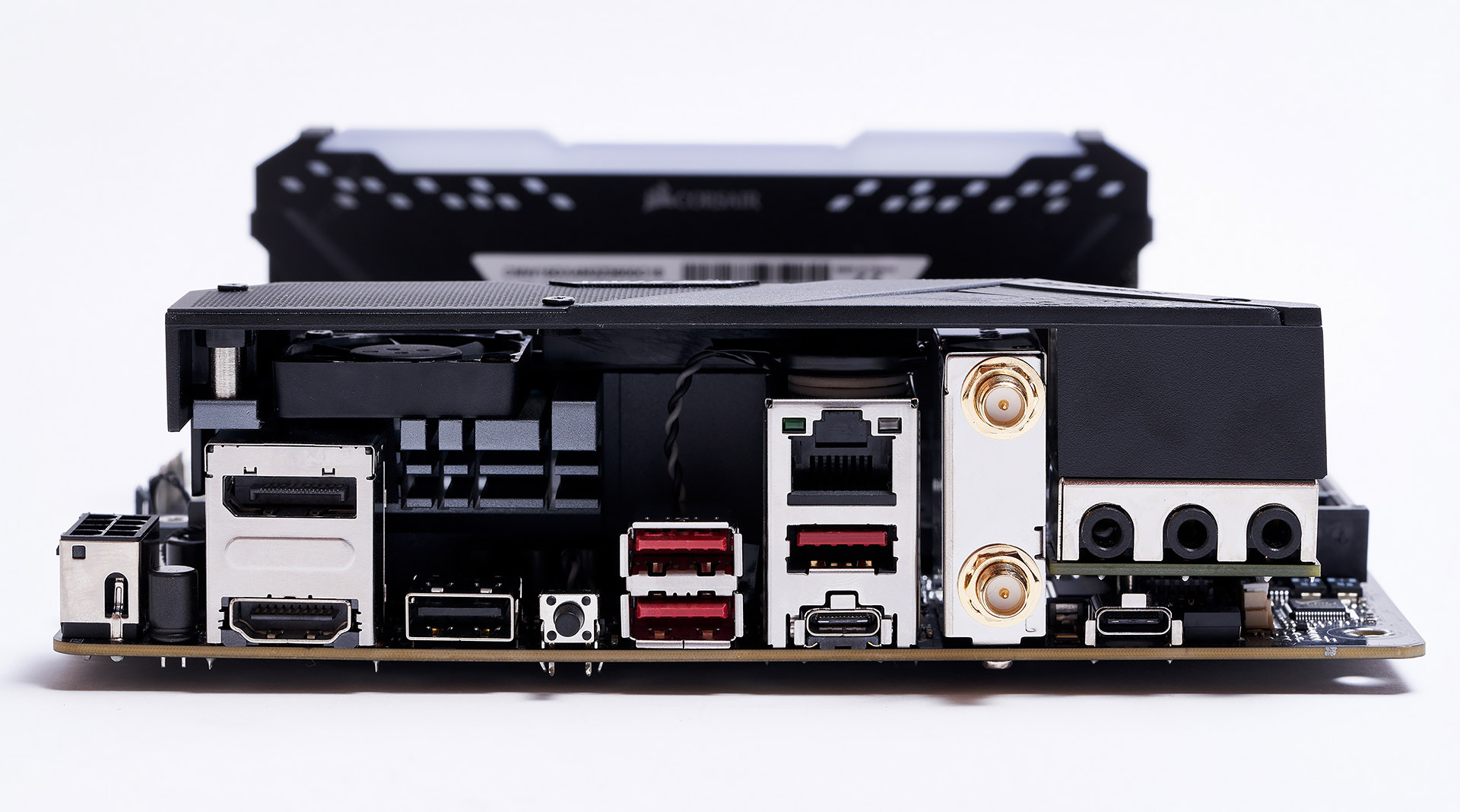 Сетевые способности платы также смогли удивить. На плате предустановлен беспроводной адаптер Wi-Fi 6 (802.11ax), который подключается к внешними антеннам с коэффициентом усиления 5 dBi. Этот модуль поддерживает и Bluetooth 5.1. Для любителей ультраплавного сетевого гейминга и быстрой передачи файлов имеется Ethernet-контроллер со скоростью передачи данных 2,5 Гбит/с на базе чипа Intel.