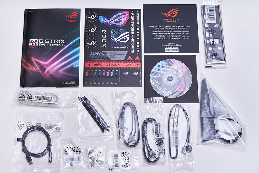 - комплект наклеек с различными изображениями серии ROG Strix, в том числе и для кабелей;