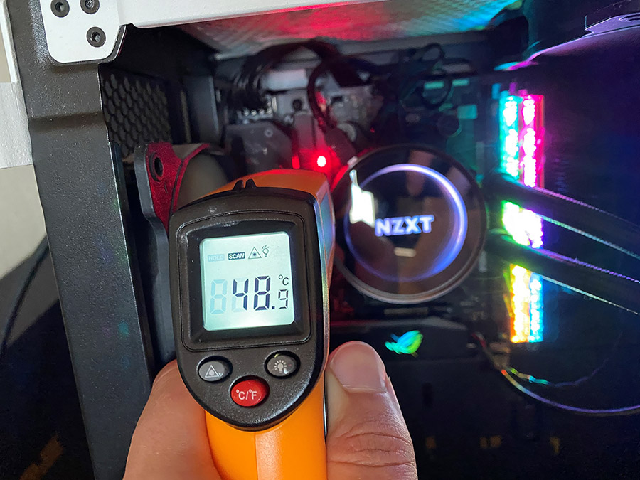 Датчиков температуры зоны VRM нет (по крайней мере по версии HWinfo), потому пришлось вручную инфракрасным термометром делать замер. Условия теста были просты: LinX на 30 минут и CPU PPT на уровне 110 Вт. Обдува зоны радиаторов не было, а встроенный маленький вентилятор не включался, поскольку температура силовых элементов не превышала 60 градусов. Звучит безусловно странно, «нет датчика температуры, но при этом вентилятор включится после 60 градусов».