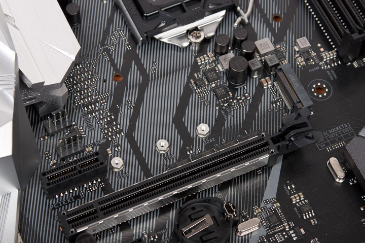 Над основным гнездом PCI-E есть ещё одно посадочное место под устройства M.2. Оба они, правда, ограничены до размера типа 2280.