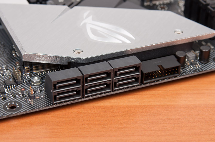 Шесть продольных выходов SATA соседствуют с также продольным классическим гнездом под кабель для интерфейса USB третьего поколения.
