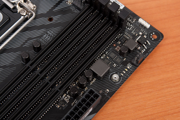 Удивительно или нет, но сюда подсистема стабилизатора напряжений перекочевала без малейших изменений относительно продуктов ASUS прошлого поколения. Схема базовая для многих моделей, отталкиваться можно от Prime Z270-A (и даже Prime Z170-A). ШИМ-контроллер — ASP1400BT, ему помогают шесть внешних драйверов, то есть четыре канала ответственны за процессорное, а два — за напряжение на интегрированном ГП. Привнесение — новые модели транзисторов (как для продукции ASUS). Это SiRA12DP и SiRA14DP от Vishay Intertechnology. По паре входит в состав каждого канала у ЦП, всего 16 элементов. Для ГП их шесть, четыре более мощных и пара послабее (SiRA14DP). Всего получилось шесть штук (два из них распаяны на обратной стороне и работают без участия радиатора).