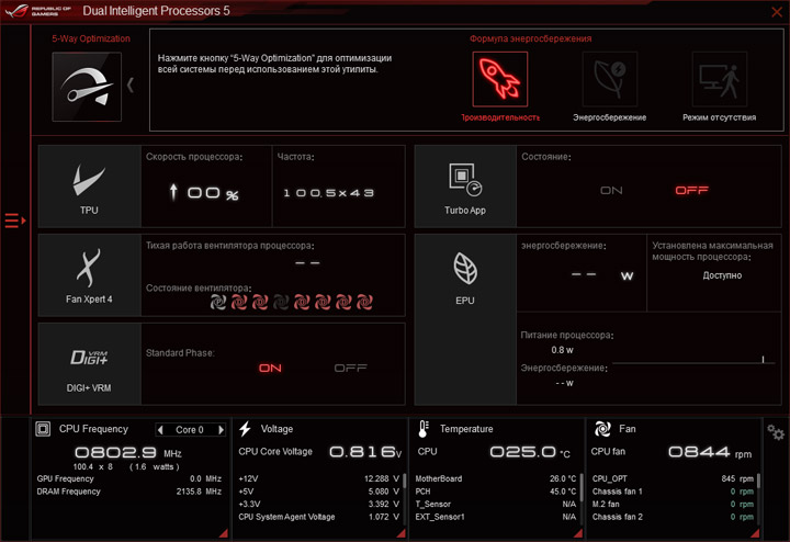 Наличие Dual Intelligent Processors 5, набора компонентов, включённых в Ai Suite 3, означает отсутствие единого мастера по настройке системы из Windows. Используя компонент TPU, можно изменить фактически все те же напряжения, что заложены в UEFI. Прочие компоненты ни в чём не изменились, не стану очередной раз останавливаться на базовых возможностях фирменного комплекса от ASUS. Все желающие могут изучить набор по прошлым материалам, например, выбрав обзор ASUS Maximus IX Hero.