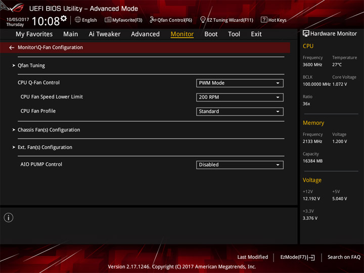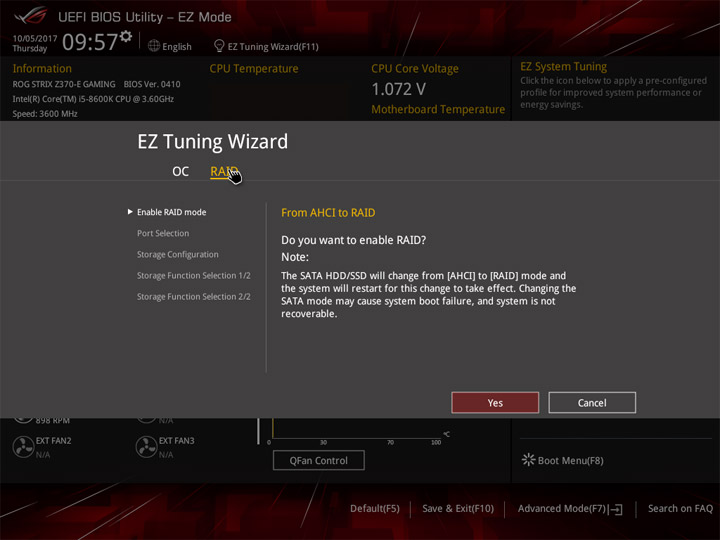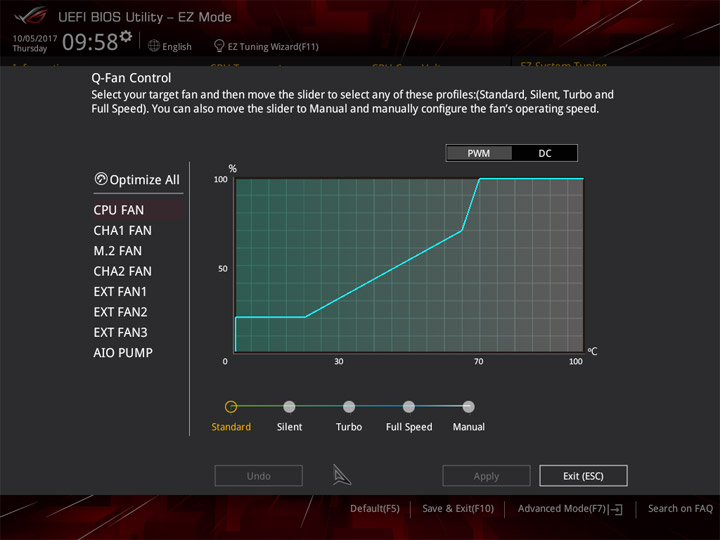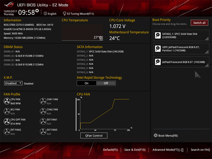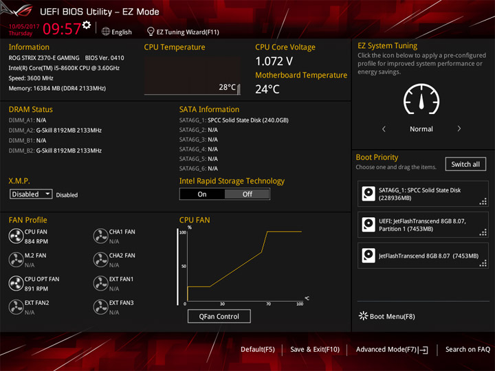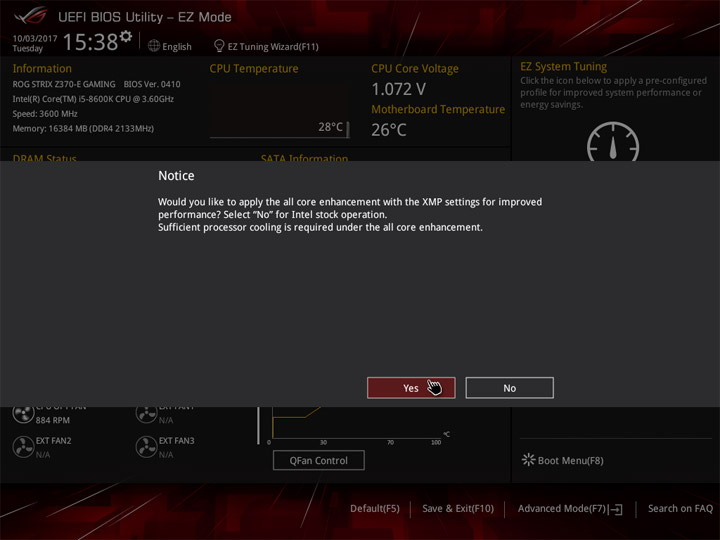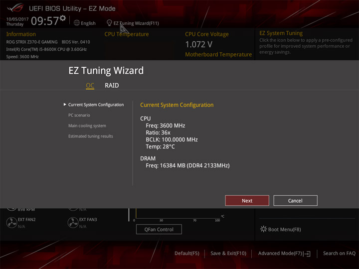 Упрощённая настройка проходит в режиме Ez Mode. Для увеличения производительности системы тут можно активировать XMP либо же воспользоваться мастером по настройке (разгону) Ez Tuning Wizard. Ещё один вспомогательный компонент — Q-Fan Control, необходимый для наладки схемы охлаждения.