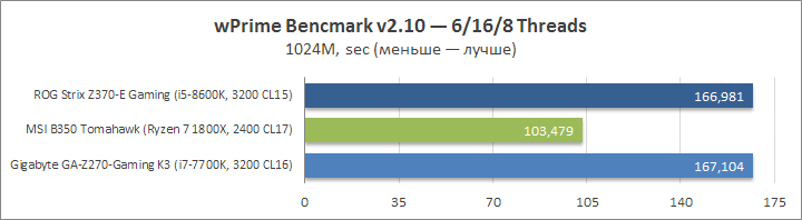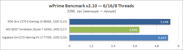 Достаточно любопытное равенство получилось в несложной wPrime: шесть реальных ядер догоняют восемь потоков, образованных при содействии HT, даже при собственной меньшей частоте. 16 потоков у R7 недосягаемы.