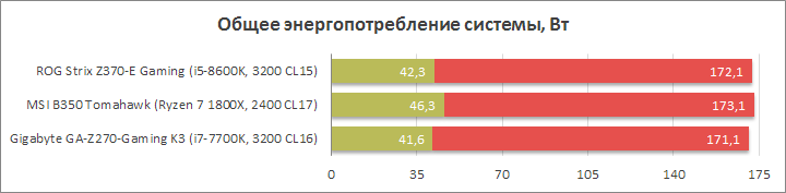 Замеры выполнялись после прохождения всех прочих тестов в «устоявшемся» режиме компьютера при помощи прибора собственной разработки. Для создания нагрузки использовался профиль In-place large FFTs в составе утилиты Prime95 (версии 29.3 — для Core i5, для остальных — 28.10). Производился расчёт среднего значения потребления тестового стенда «от розетки» на протяжении восьми минут работы программы, а затем, после завершения теста, ещё минуту замерялся уровень, соответствующий состоянию простоя системы.