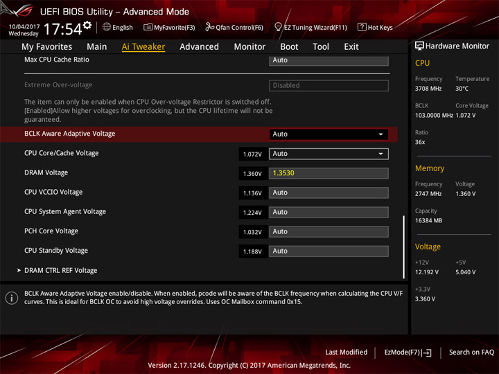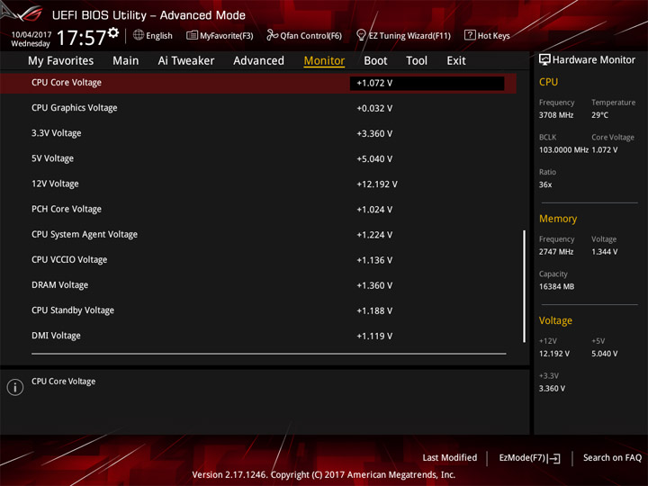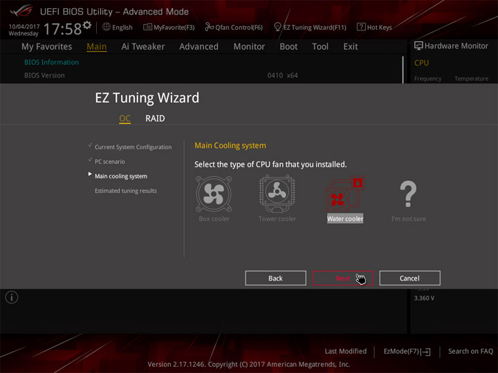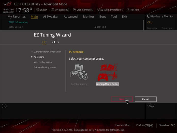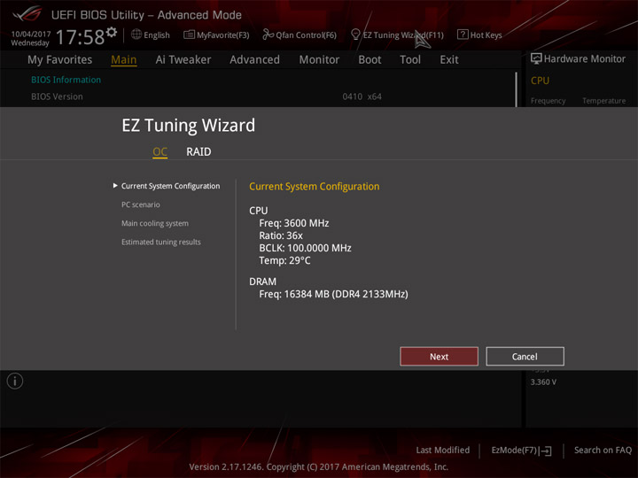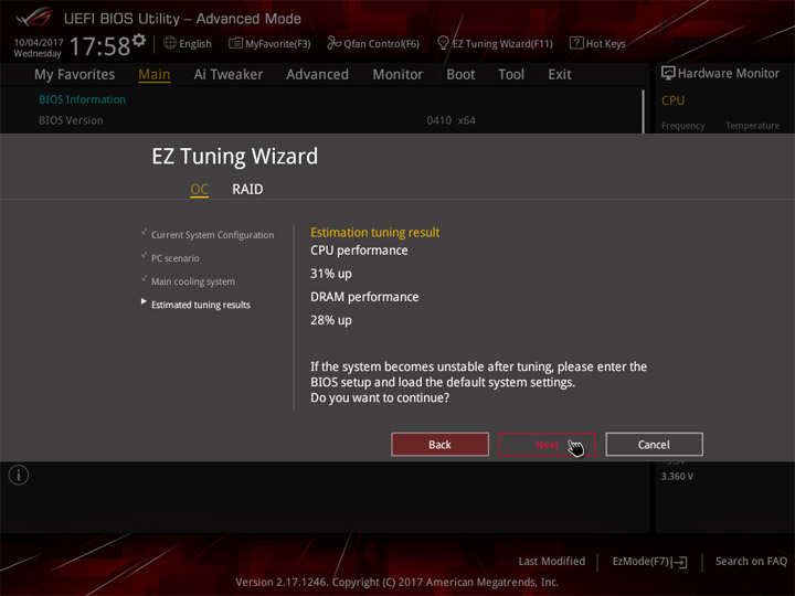 Первым тестируемым механизмом был интерактивный сценарий Ez Tuning Wizard. Максимальные отметки будут активированы в случае выбора пунктов Gaming/Media Editing и Water cooler: 31% для ЦП означает 4738 МГц, а у памяти 28% равняются 2746 МГц. Явно будет указана только величина DRAM Voltage, однако, согласно встроенному в UEFI мониторингу, реальные значения сопутствующих параметров оказались заметно ниже, чем при работе с профилем XMP.