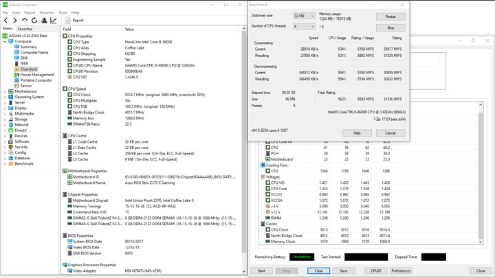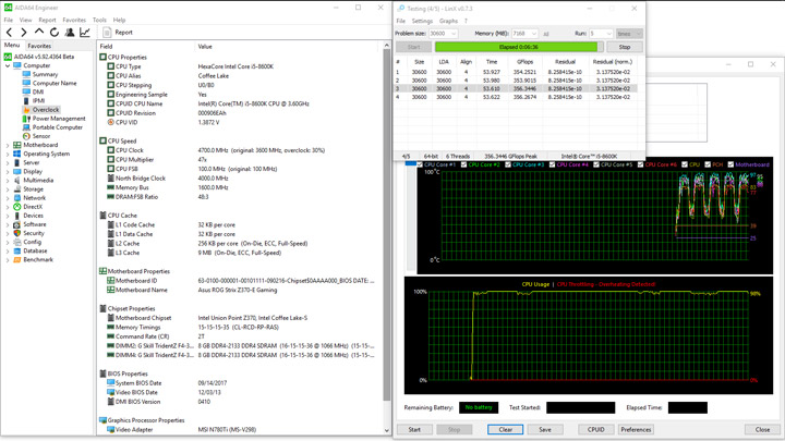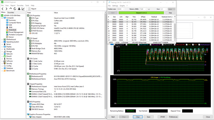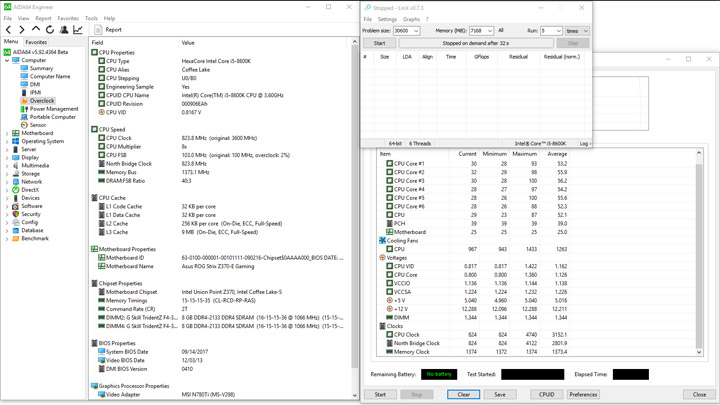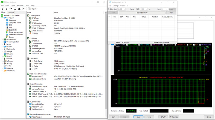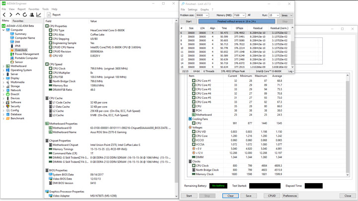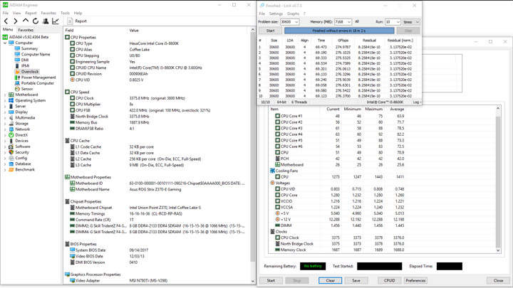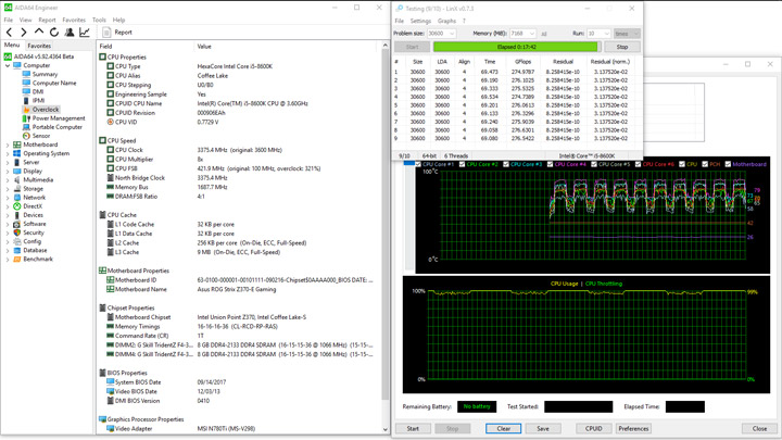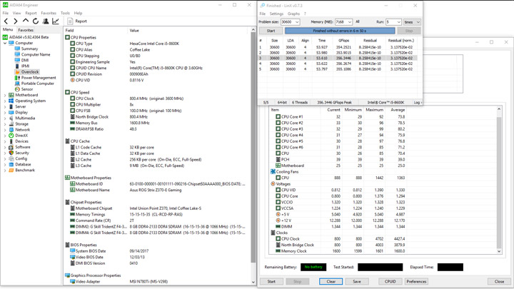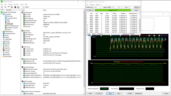 Настоящим энтузиастам известен близкий финальный рубеж при граничном оверклокинге R7, Core i7-7700K тоже достаточно горяч, даже при замене у него штатного термоинтерфейса под теплораспределительной крышкой. Весьма любопытно посмотреть на потенциал шестиядерной новинки от Intel. Но прежде, для полноты картины, я опишу поведение ROG Strix Z370-E Gaming. Активация готового профиля у памяти неожиданно привела к резкому росту напряжений IO и SA: со штатных 0,95 В и 1,05 В — до 1,33 и 1,23 вольт! Совершенно непонятно такое поведение устройства, я могу это объяснить лишь сыростью прошивки и установкой инженерами задела для случаев использования самых неудачных наборов ОЗУ. В зависимости от типа нагрузки, напряжение на ядрах составляло 1,216–1,232 В. Для искусственно установленного рубежа в 4,3 ГГц это, на мой взгляд, достаточно невысокие отметки.