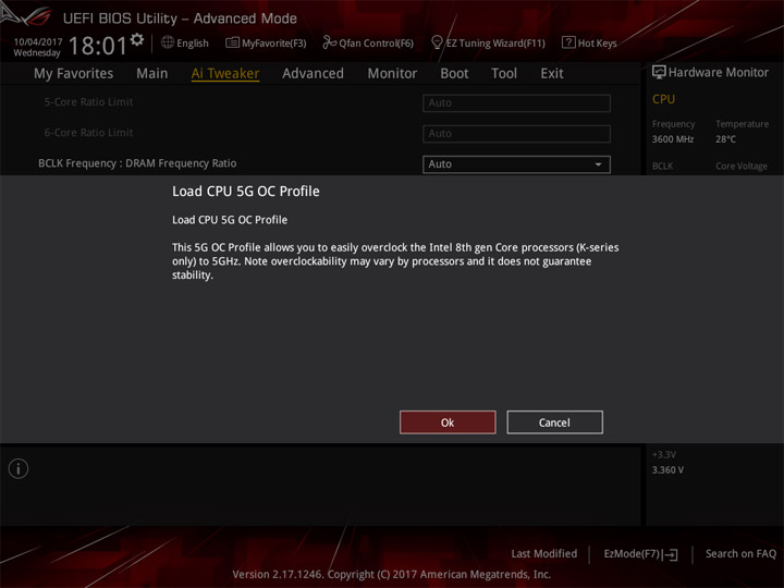 Следующий профиль от разработчиков рассматриваемой платы — 5G OC. Тут формулы для памяти, IO и SA Voltage оказались штатными, а вот множитель ЦП, как и следовало ожидать, оказался зафиксирован на отметке «50». В простое напряжение равнялось паспортному (1,072 В для нашего образца).