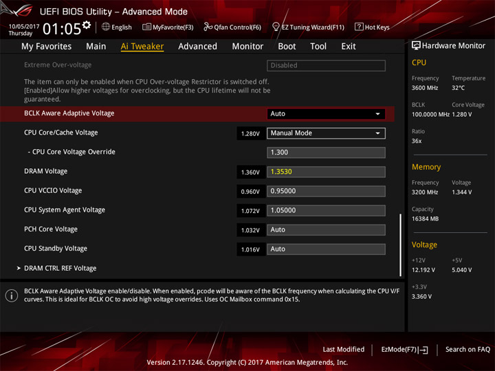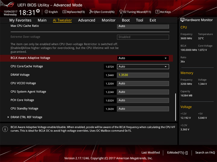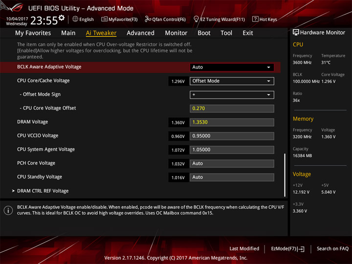 Граничной воздушной отметкой для нашего образца Core i5-8600K стала величина «5300 МГц». Для продвижения дальше нужно заметно повышать напряжение (выше психологических отметок). Понять принцип работы механизма формирования добавочного напряжения я так и не смог, пришлось просто его наращивать величину до нужной отметки, необходимую под стабильную работу системы. А для 3,2 ГГц у набора памяти добавочные напряжения повышать и вовсе не потребовалось.