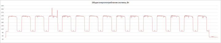 Во время такого теста нагрев в области VRM составил 81 °C, это температура самого горячего участка. Элементы в верхней части платы не грелись выше 65 °C. Основной радиатор — ближний к задней панели — прогревался всего до 44 °C (на его верхнем крае). Какие-либо дополнительные меры по охлаждению не предпринимались. Не беря во внимание всплеск фоновой активности в системе Windows, потребление уложилось в границы 48–243 Вт.